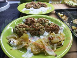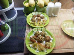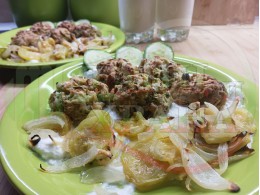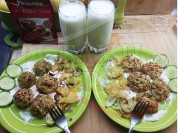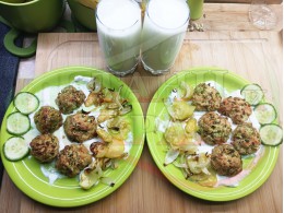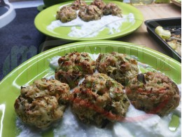 Зеленчукови кюфтенца "Краставичночеснови БГмерудийни" приготвени с пресни краставици, ронена чубрица, слънчогледово олио и стар чесън подходящи за постещи хора гарнирани с млечна основа с кисело мляко от България за непостещи