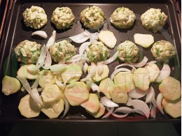 Измийте тиквичката, обелете кората, в случай че има по-големи нарянявания, нарежете я на кръгчета и я добавете към краставичните кюфтенца заедно с обеления, измит и нарязан на ивички кромид лук около 20 минути преди края на зададеното време. Дозапечете краставичните кюфтенца и гарнитурата до желаната от вас степен (средно запечени кюфтенца, тиквички и лук или по-запечени).