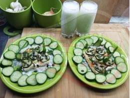Българско краве бяло сирене "Краставично пряснолучено киселомлечно копърово" запечено на фурна с пресни краставици, зелен лук и червен сладък пипер гарнирано върху млечна основа със свеж копър, стар чесън и кисело мляко от България - двукомпонентна