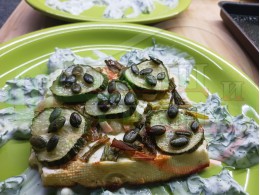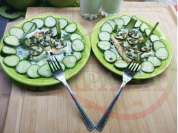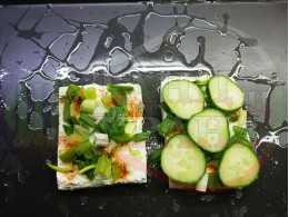 Разпределете равномерно количество от млечната основа в чиниите и я размажете по дъното (или оформете произволни фигури). Поставете по едно парче от запеченото сирене с лука, краставиците и тиквените семки върху млечната основа в средата на чиниите и подредете равномерно количество от краставичните кръгчета по диаметъра на чиниите. Украсете порциите с перцата на пресния лук (украсете по ваше желание и усмотрение).