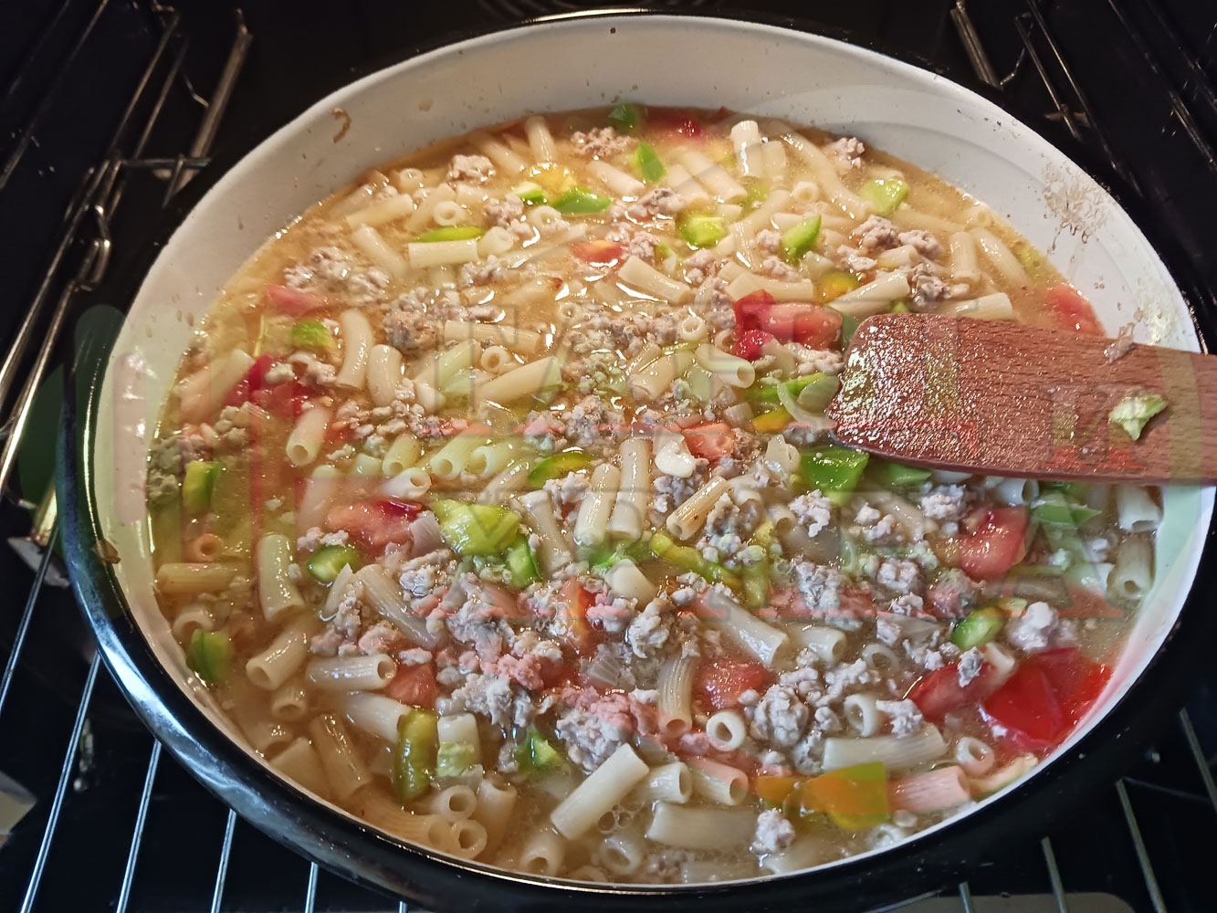 Макарони "Каймяни със зелени чушки" запечени на фурна с кайма, зелени пресни чушки, кромид лук, домати, стар чесън и кашкавал