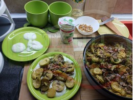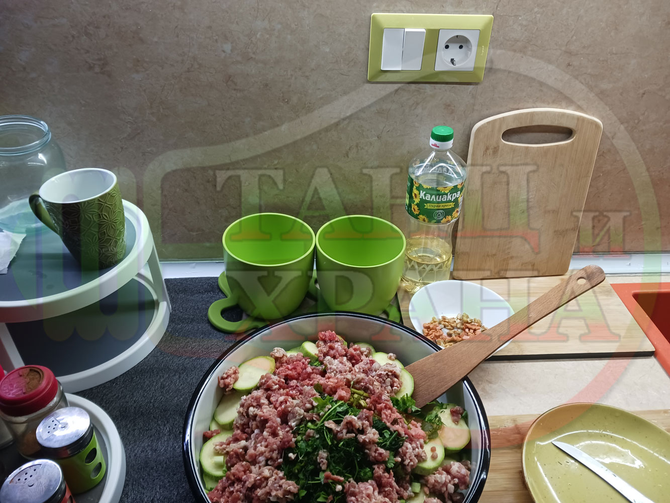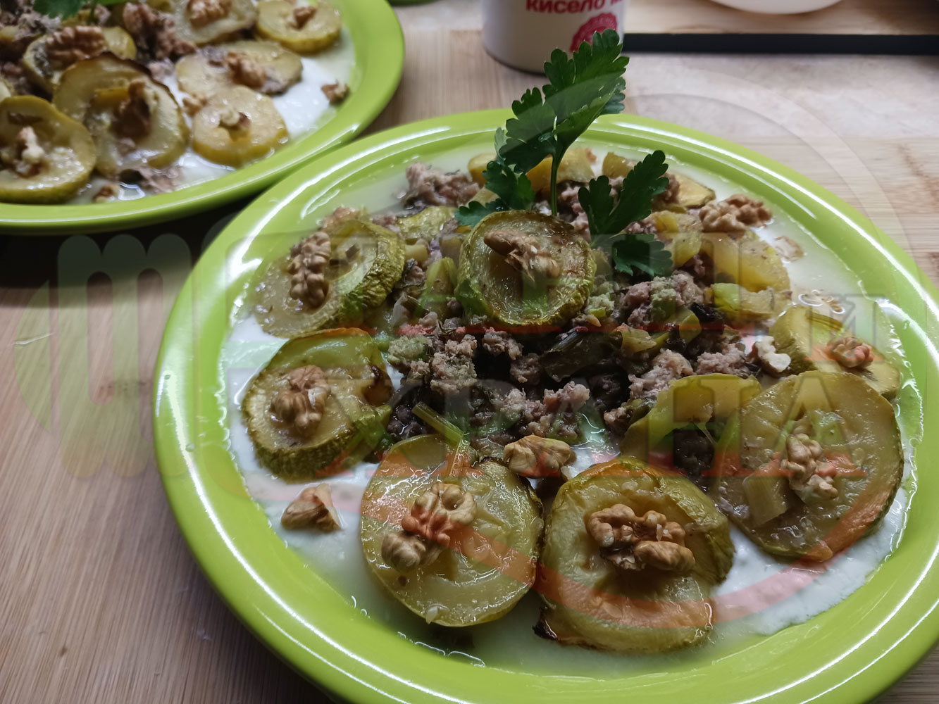 Тиквички "Тикмляно" приготвени на фурна с кайма (свинско и телешко), пресен лук, свеж магданоз, копър, сурови орехи и кисело мляко от България