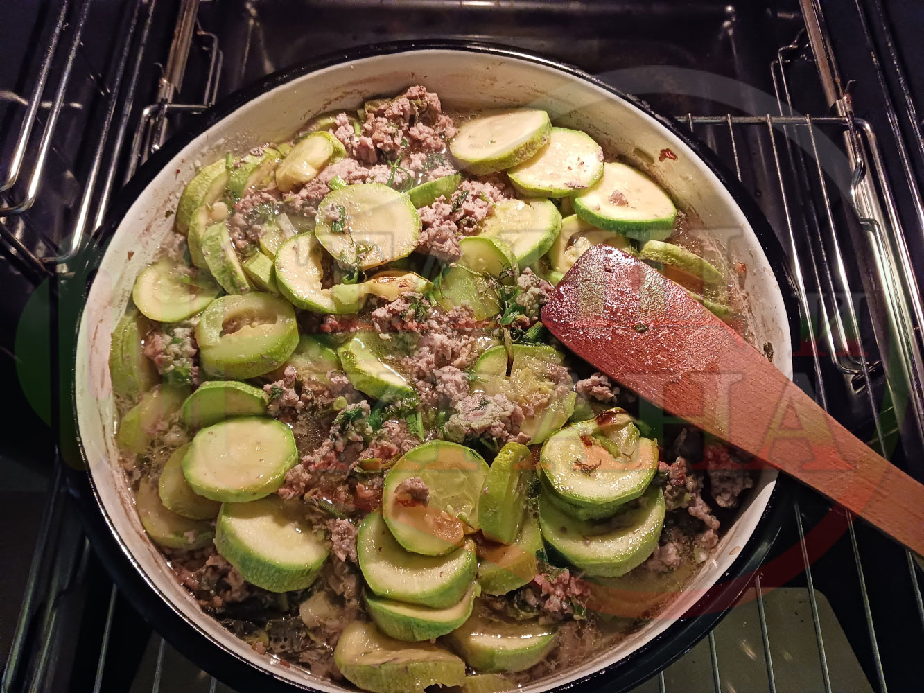 Измийте, нарежете тиквичките на кръгчета и ги сипете в тава за печене. Измийте и нарежете лука, магданоза и копъра на едро. Добавете ги в тавата. Добавете каймата и разбъркайте. Препоръчвам да добавяте каймата на два пъти и да разбърквате след всяко добавяне. Налейте топла към гореща вода от чешмата и добавете солта. Разбъркайте и загладете. Поставете тавата във фурната. Запечете на фурна без вентилатор на 180 градуса за около 90 минути.