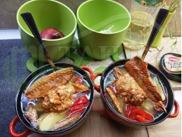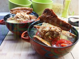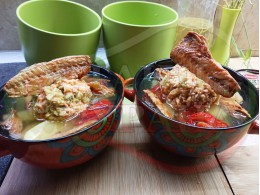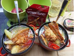 Българска рибна супа "Скумриевоподлютена кашкавалена картофеночервеночушкова" приготвена със скумрия в подлютен доматен сос от консерва и млечен кашкавал оформена като големи топки гарнирана с рибни филета - производна (2)