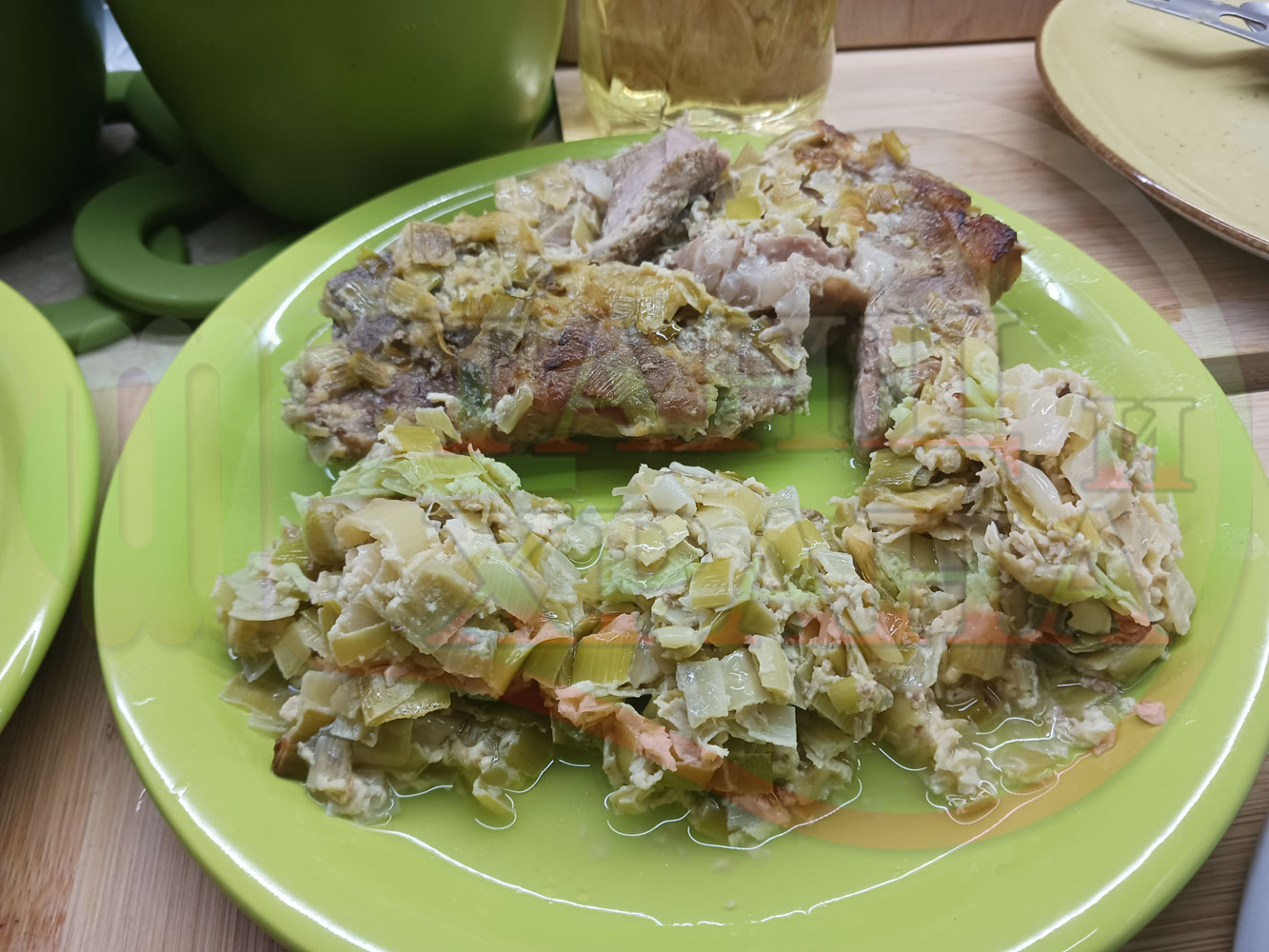 Свински вратни пържоли "Празжолицаене" запечени на фурна с праз лук, краве бяло сирене, краве масло и яйца