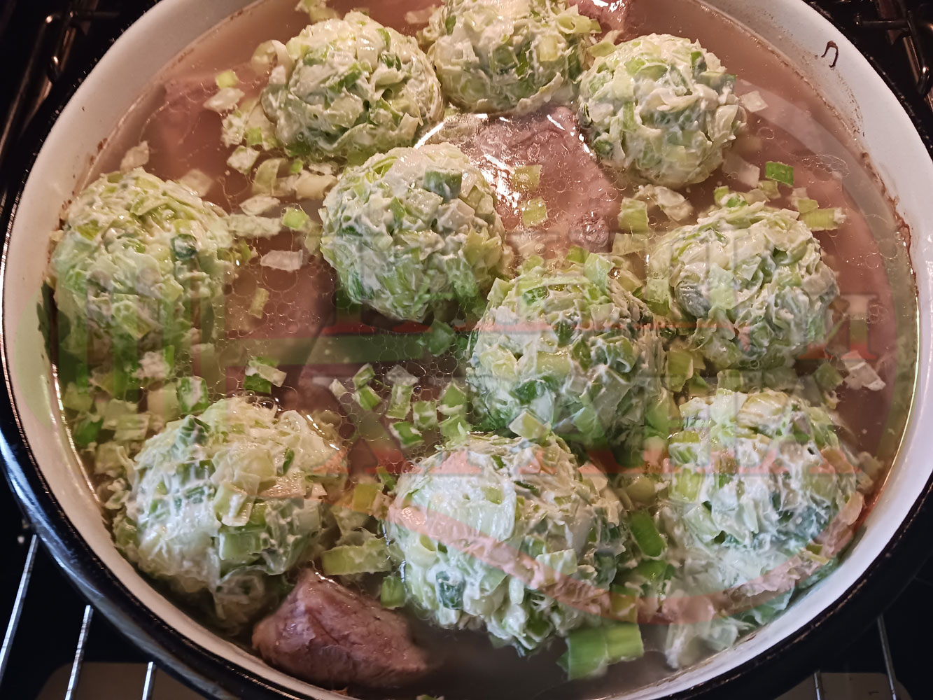Извадете тавата след като изтекат минутите. Подредете внимателно лучените кюфтета. Поставете отново тавата във фурната. Доварете и запечете на фурна без вентилатор на 180 градуса за около 60 минути.