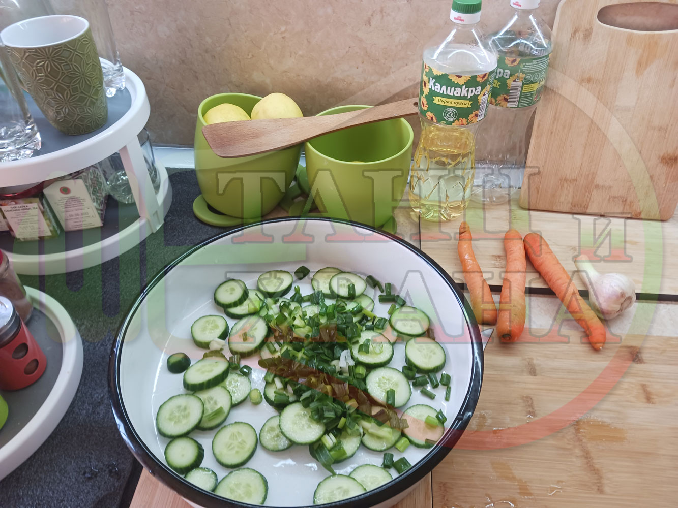 Измийте пресния лук, краставицата и морковите. Нарежете лука на едро а краставицата и морковите на кръгчета. Изсипете нарязаните продукти в тава за печене и сипете олиото. Измийте, обелете и нарежете картофите на едро и ги добавете в тавата. Разбъркайте и поставете тавата в предварително загрятата фурна. Запечете и задушете зеленчуците около 10 минути на фурна без вентилатор на 180 градуса. Разбъркайте ги поне един път докато ги задушавате.