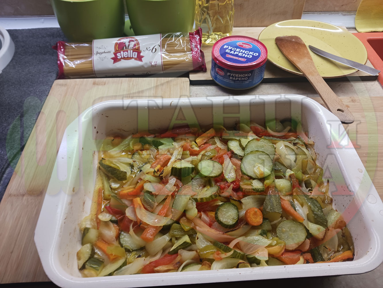 Спагети с русенско варено "Русенско със зеленчуци" приготвени на фурна с моркови пресни краставици и домати, кромид лук, краве масло и зелени пресни чушки