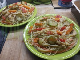 Няма как да опиша голямата вкусотия (вкуснотия), която се получава от съчетанието на овкусени спагети с пресни зеленчуци (сварени със зеленчуците) и гарнирани с русенско варено. Аромат на масло, разтекло се от топлината на спагетите и аромат на запечени чушки, домати, краставици и лук в съчетание с аромата на русенско варено.