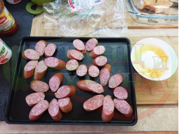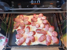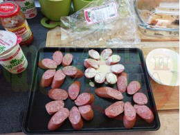 Сипете слънчогледовото олио в тава за печене, размажете го равномерно по тавата и наредете обелената, измита и нарязана на едри елипсовидни кръгове наденица (подредете нарязаната наденица в произволни фигури). Изсипете яйчено млечната смес върху подредената наденица, така че да покрие и пространството около наденицата. Поставете тавата в предварително загрятата фурна (загрейте я за поне 5 минути) и запечете на фурна без вентилатор на 180 градуса за около 15 минути.