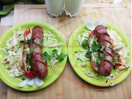 ПРОДУКТИ: Приблизителни количества за българска закуска "Родопсконаденицова червеночушкова яйченокиселомлечна" запечена на фурна с кромид лук и пълнени червени пресни чушки с родопска наденица и яйчено млечна заливка от яйца, свеж магданоз и кисело мляко от България