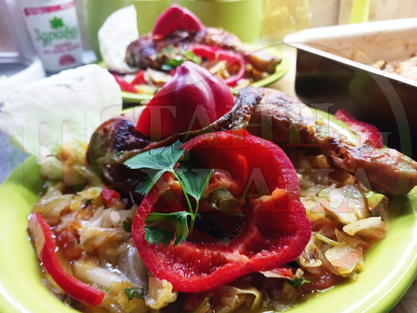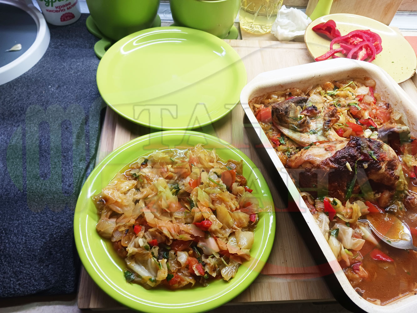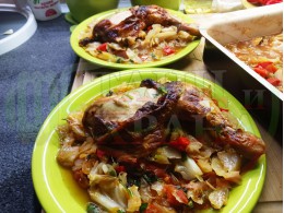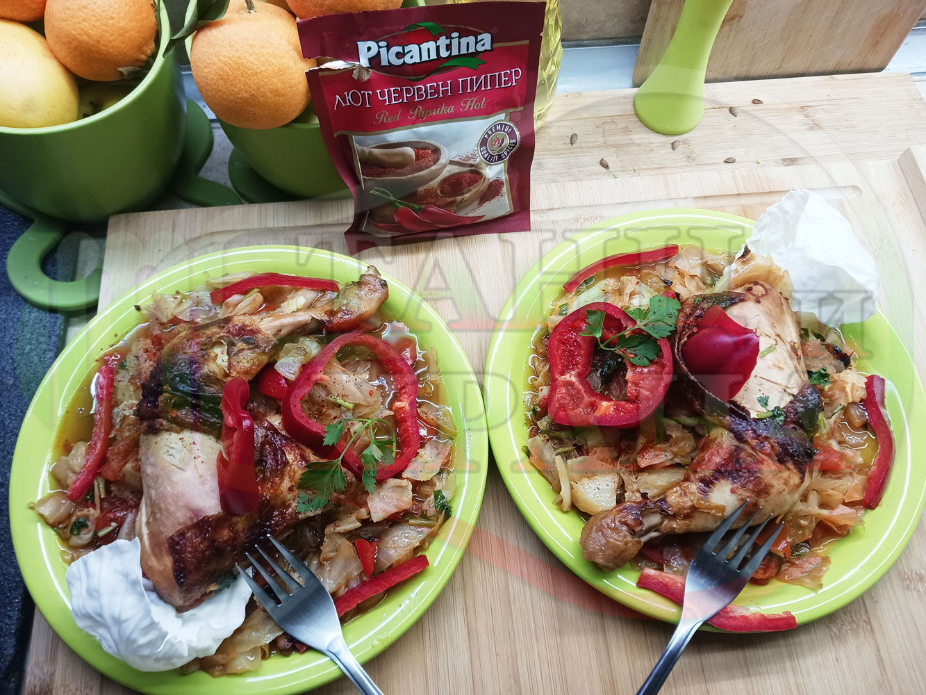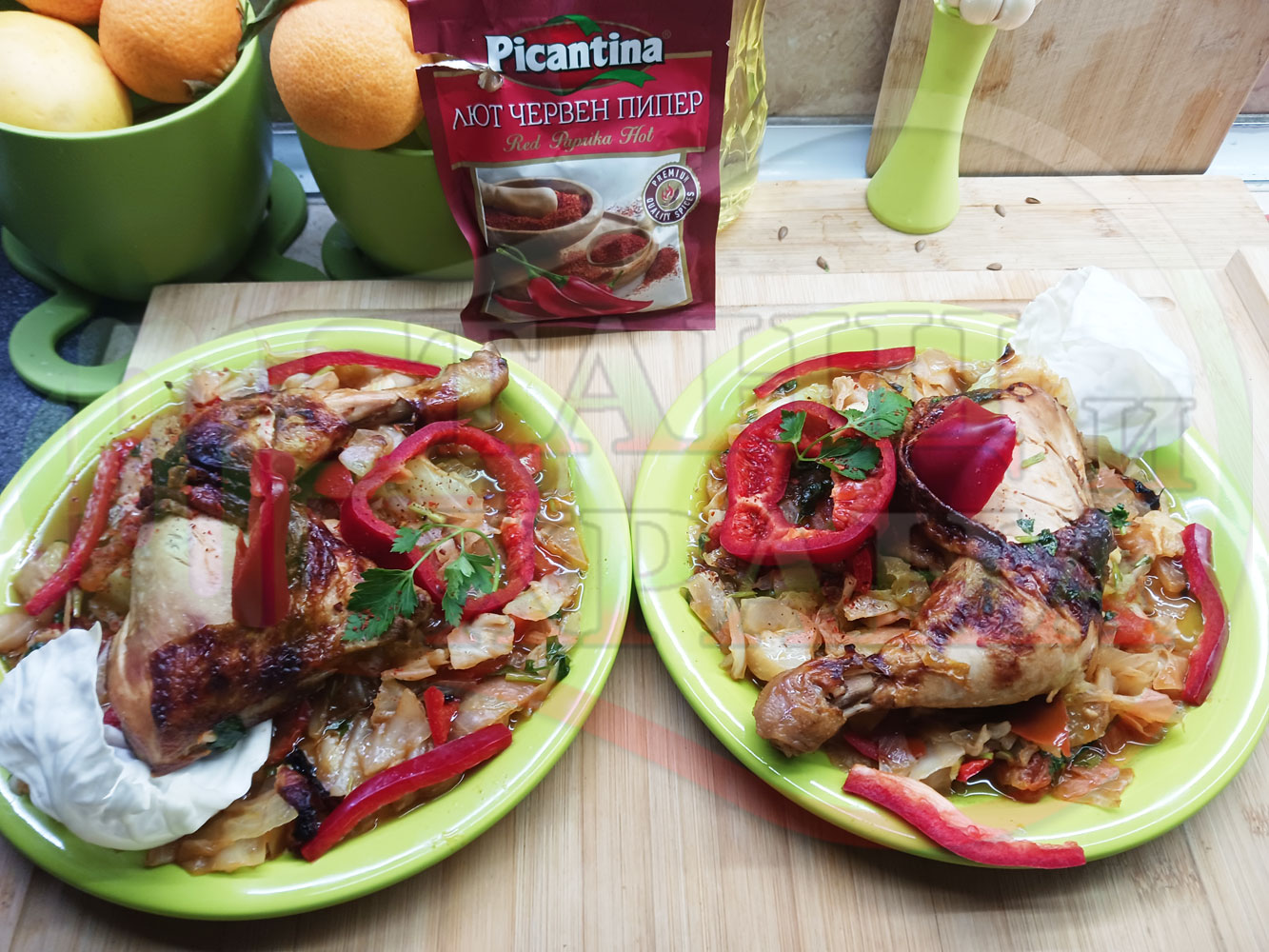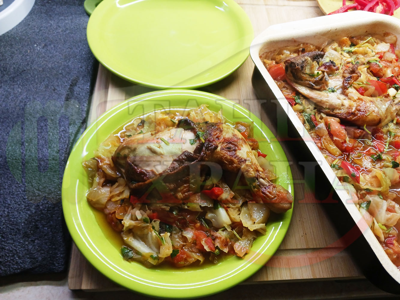 Пиле със зеле "Пряснозелево пилешкобутчено доматеночервеночушково" запечено на фурна с прясно зеле, кромид лук, домати, червени пресни чушки, краве масло, свеж магданоз, стар чесън, червен сладък пипер и пилешки бутчета