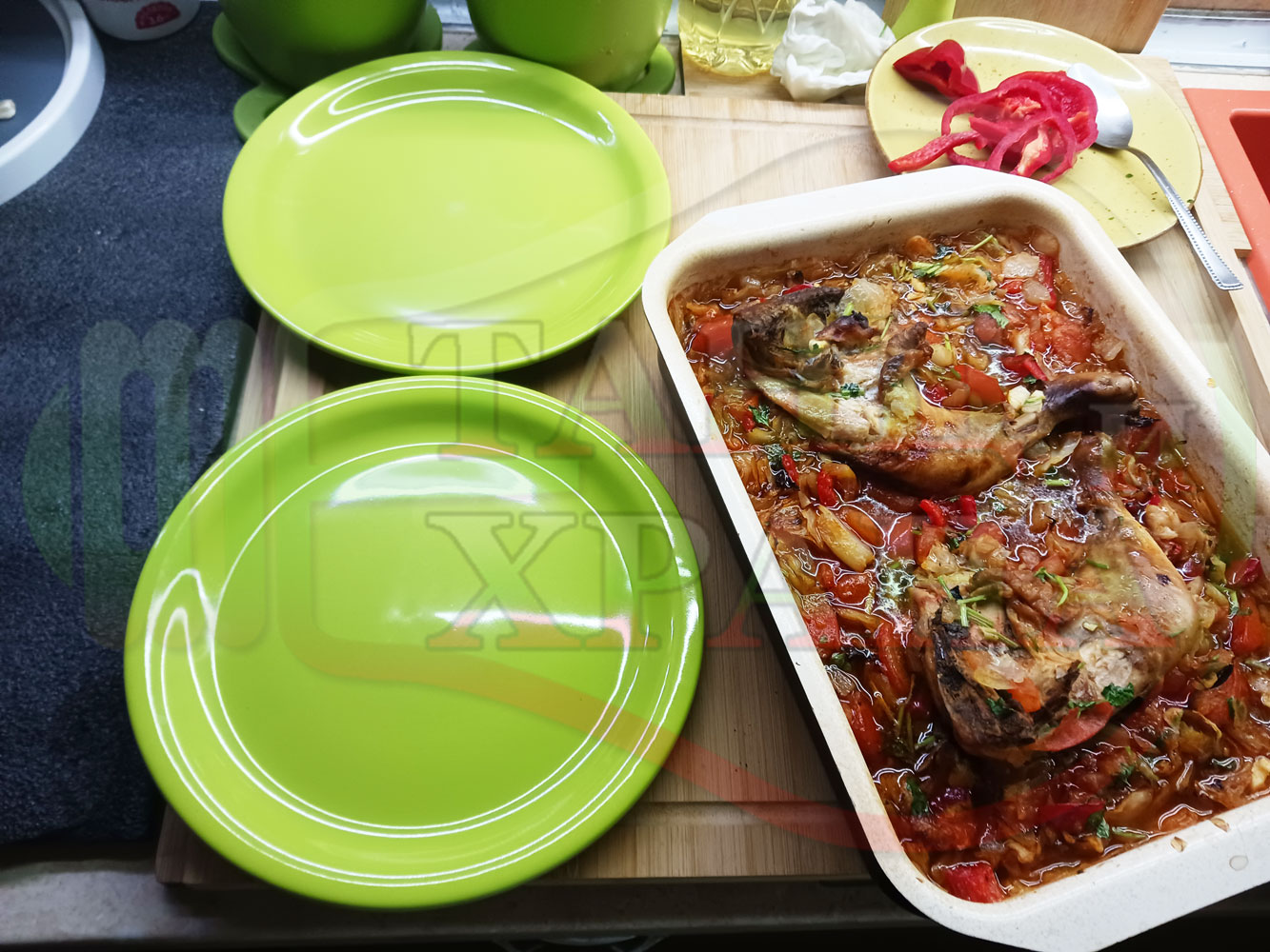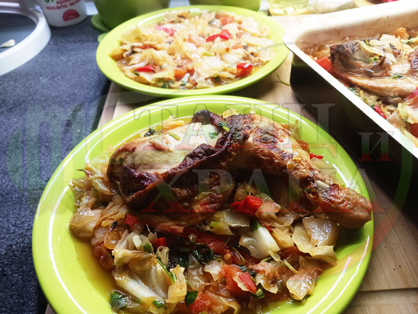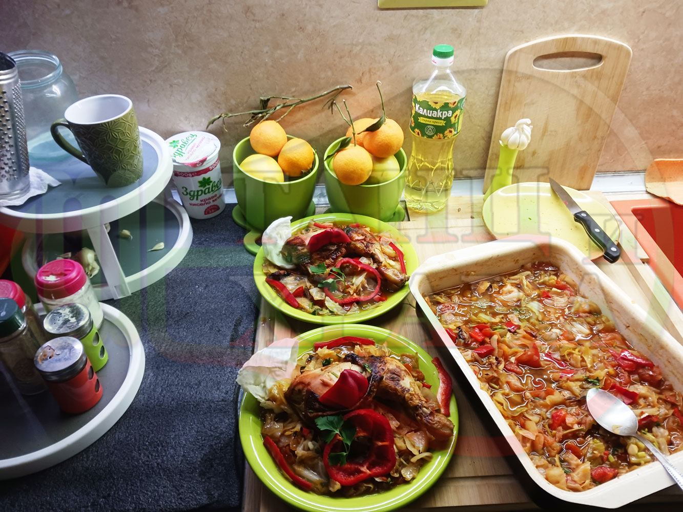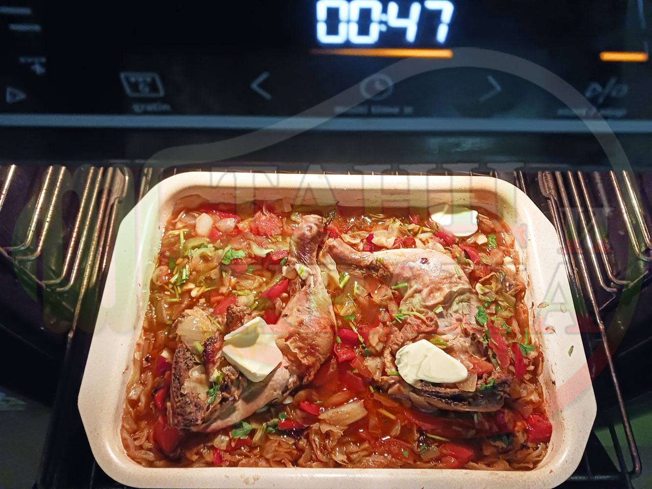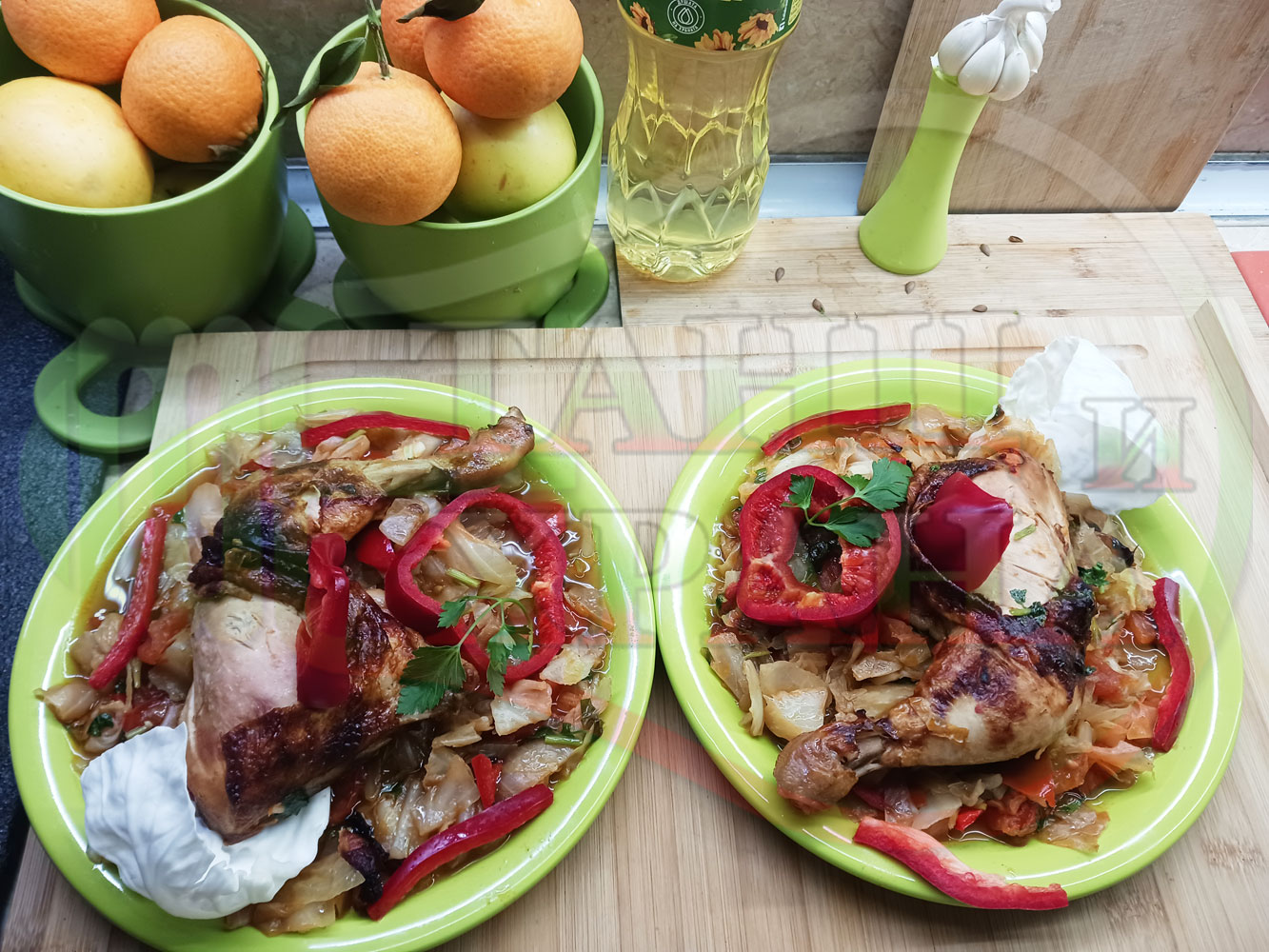 Пиле със зеле "Пряснозелево пилешкобутчено доматеночервеночушково" запечено на фурна с прясно зеле, кромид лук, домати, червени пресни чушки, краве масло, свеж магданоз, стар чесън, червен сладък пипер и пилешки бутчета