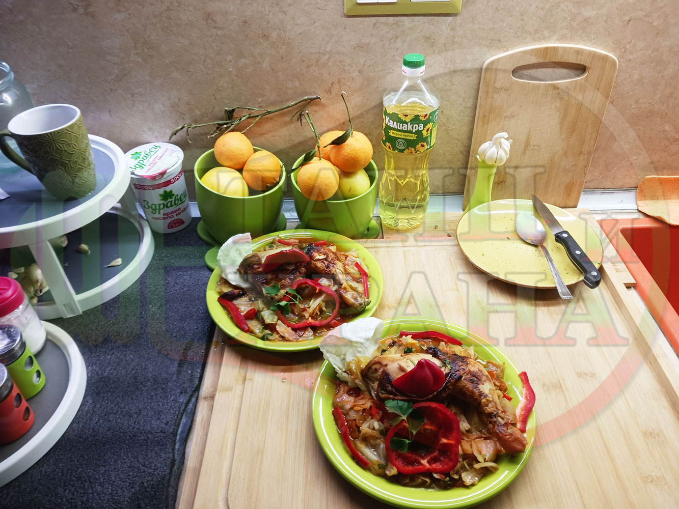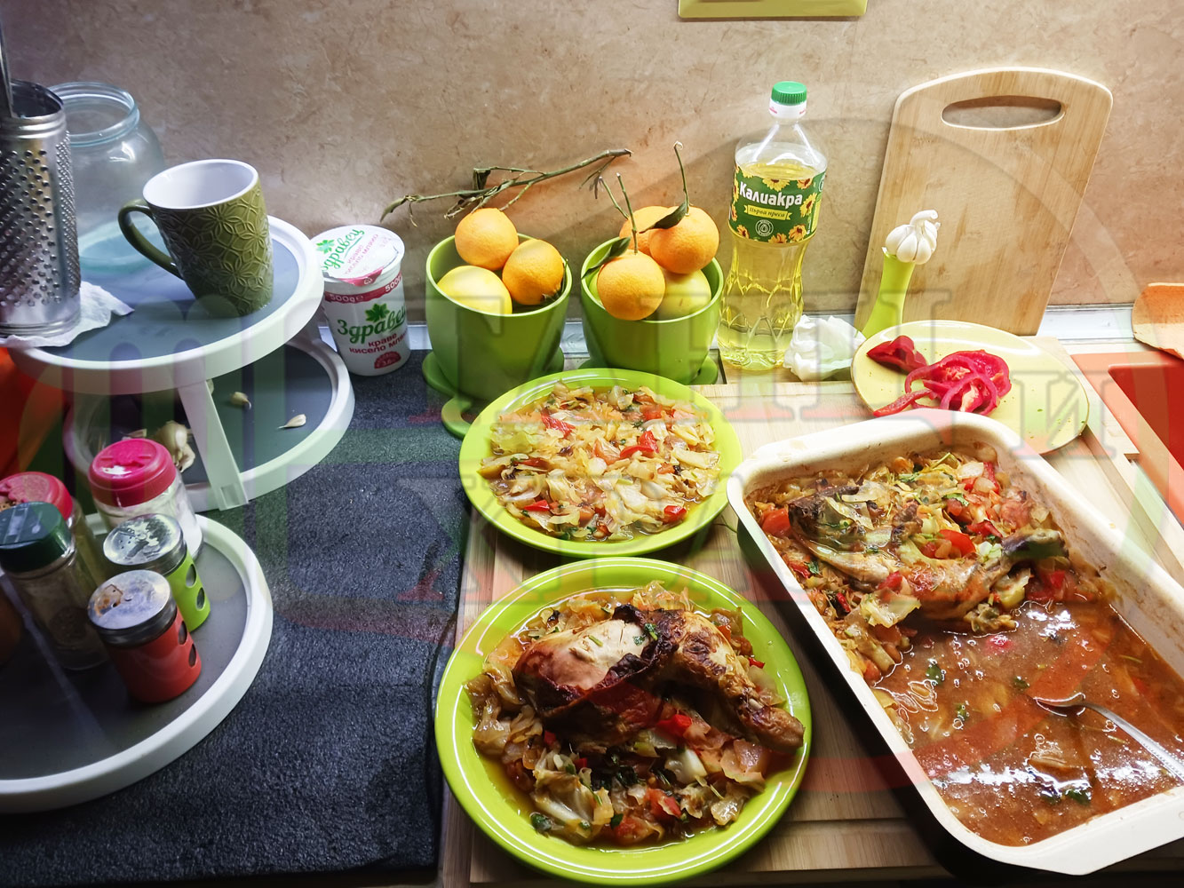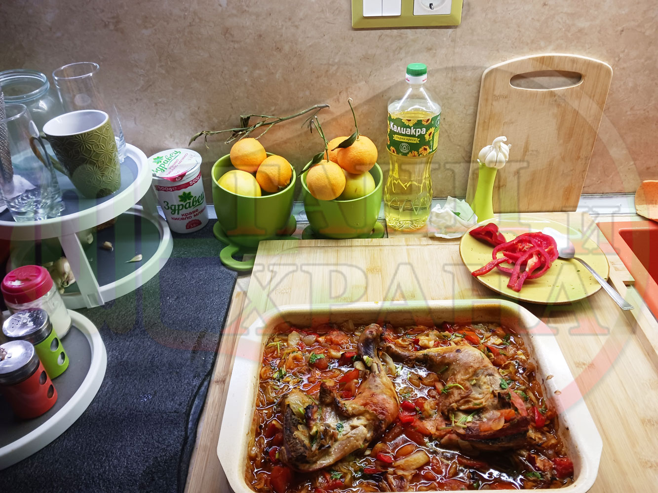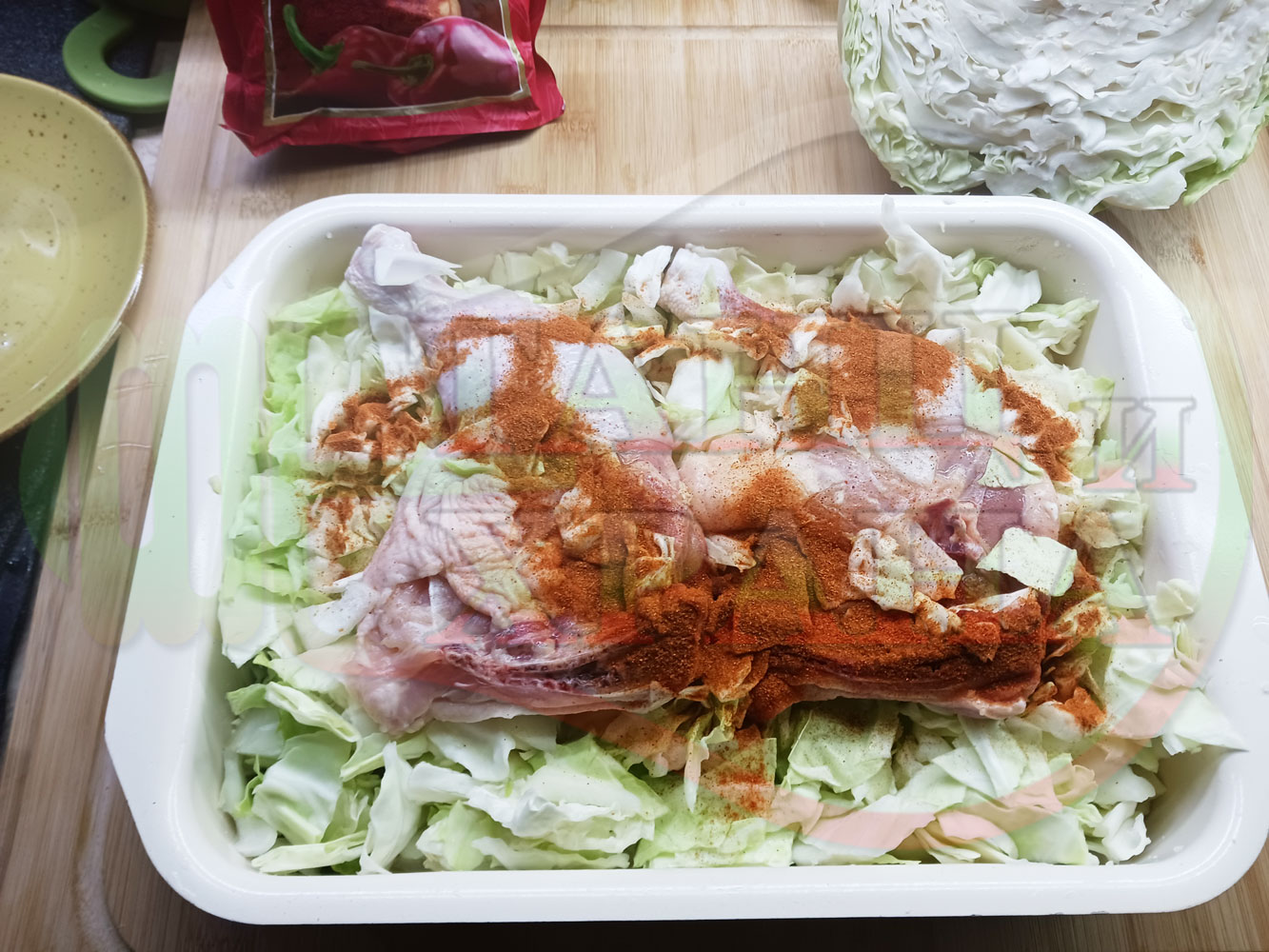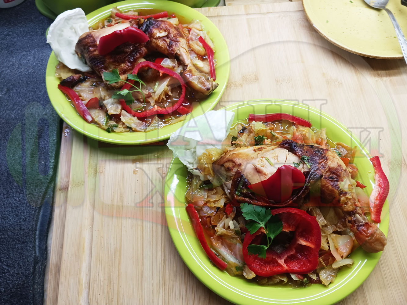 Пиле със зеле "Пряснозелево пилешкобутчено доматеночервеночушково" запечено на фурна с прясно зеле, кромид лук, домати, червени пресни чушки, краве масло, свеж магданоз, стар чесън, червен сладък пипер и пилешки бутчета