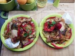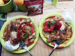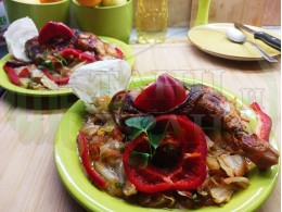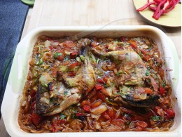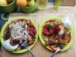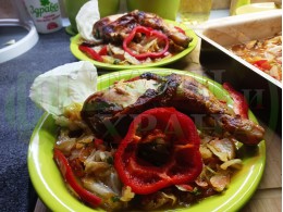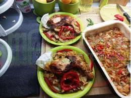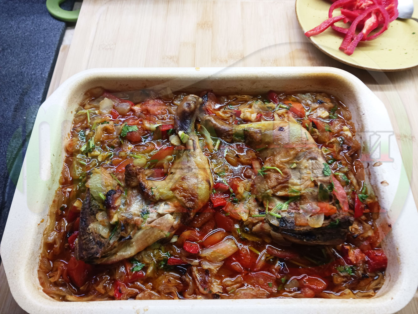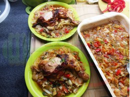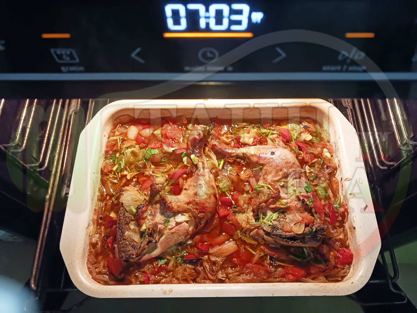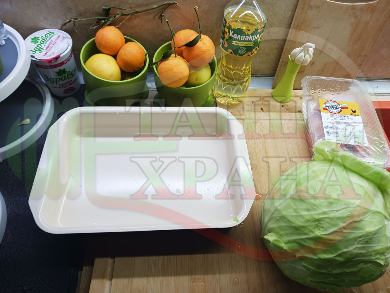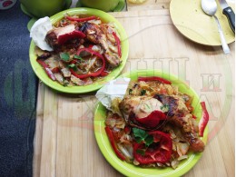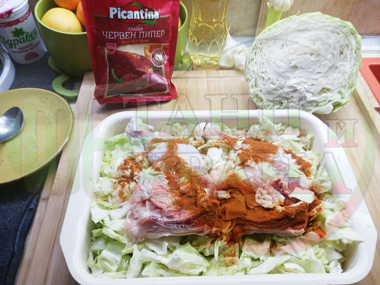 Пиле със зеле "Пряснозелево пилешкобутчено доматеночервеночушково" запечено на фурна с прясно зеле, кромид лук, домати, червени пресни чушки, краве масло, свеж магданоз, стар чесън, червен сладък пипер и пилешки бутчета