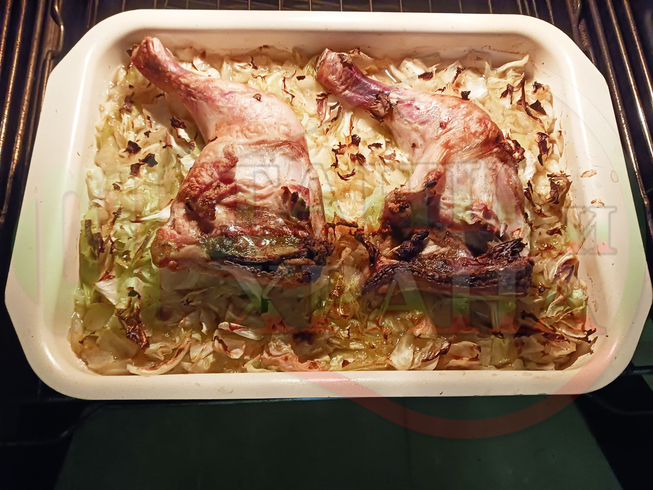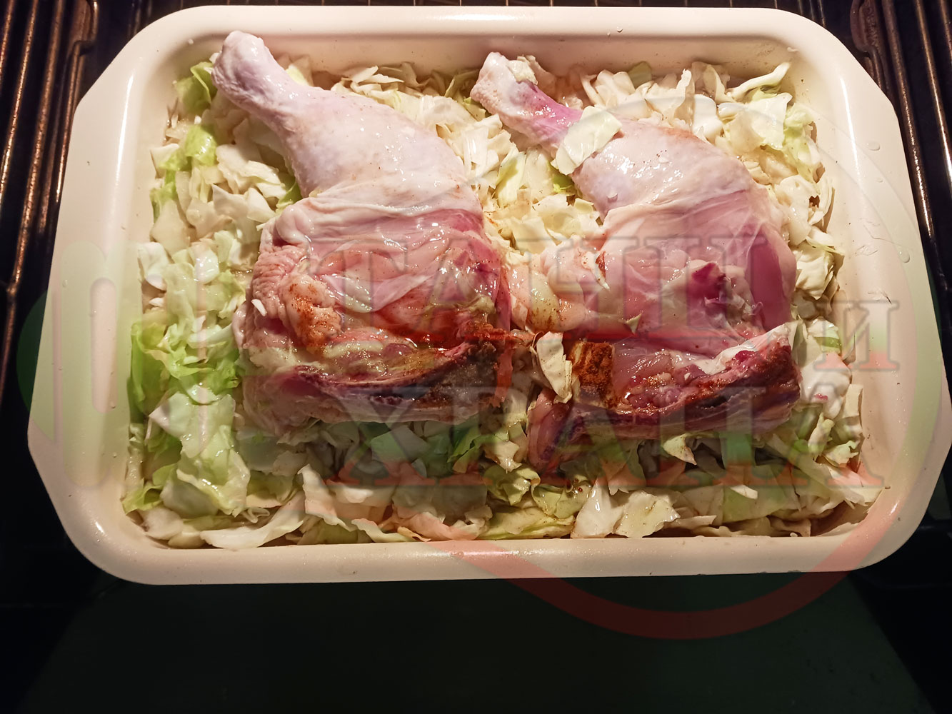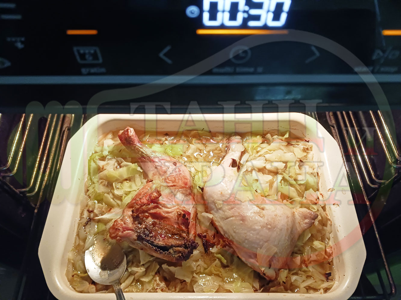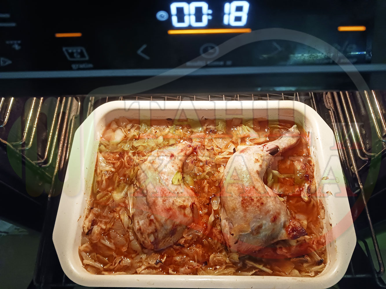 ВНИМАНИЕ: Фурните са различни и съответно времето за сваряване и запичане е ориентировъчно. Наблюдавайте процеса на запичане и при необходимост, покрийте с капак. Разбърквайте и обръщайте често пилешките бутчетата за да се запекат равномерно от всички страни и зелето да се слегне без да се препича.