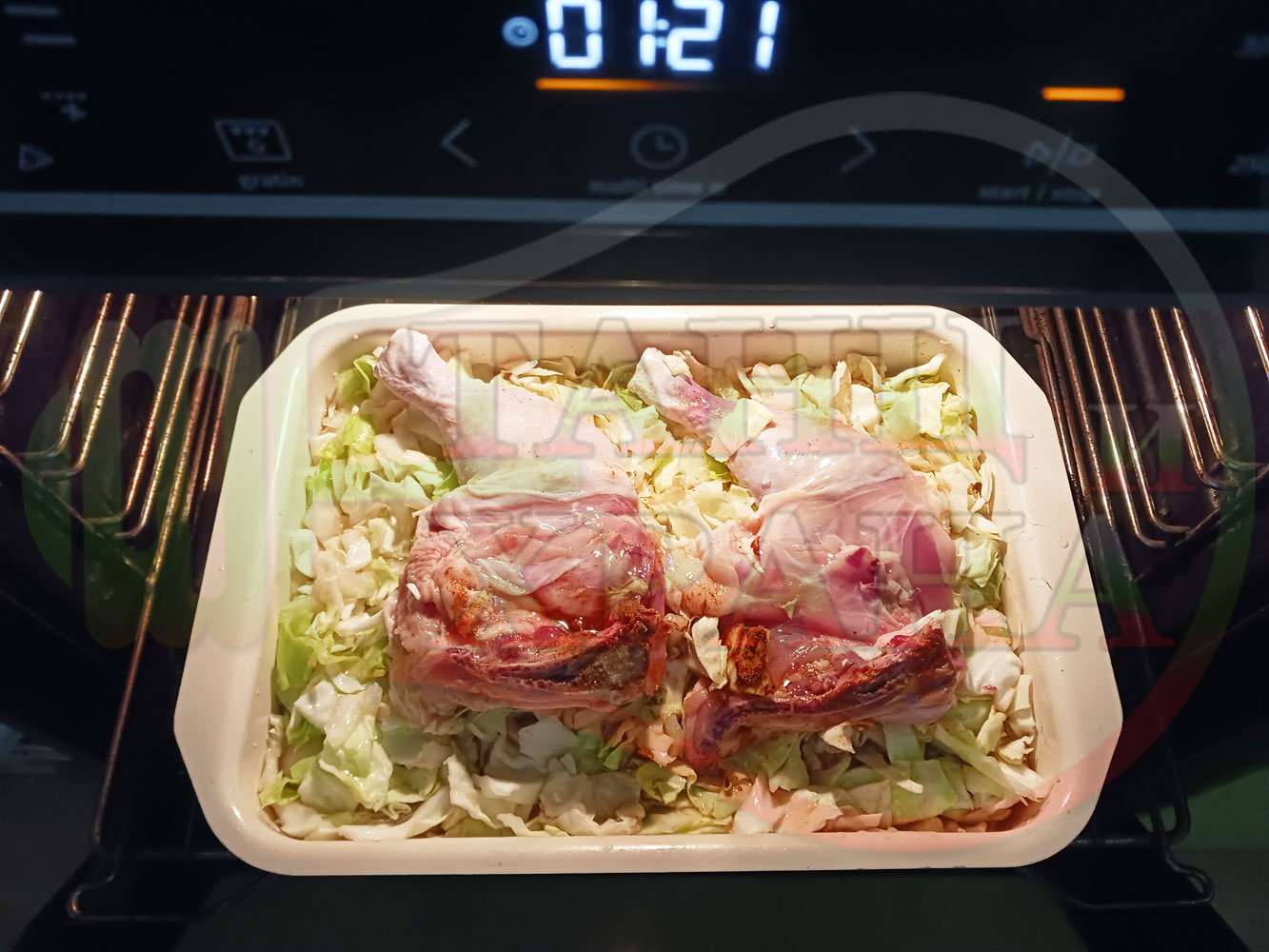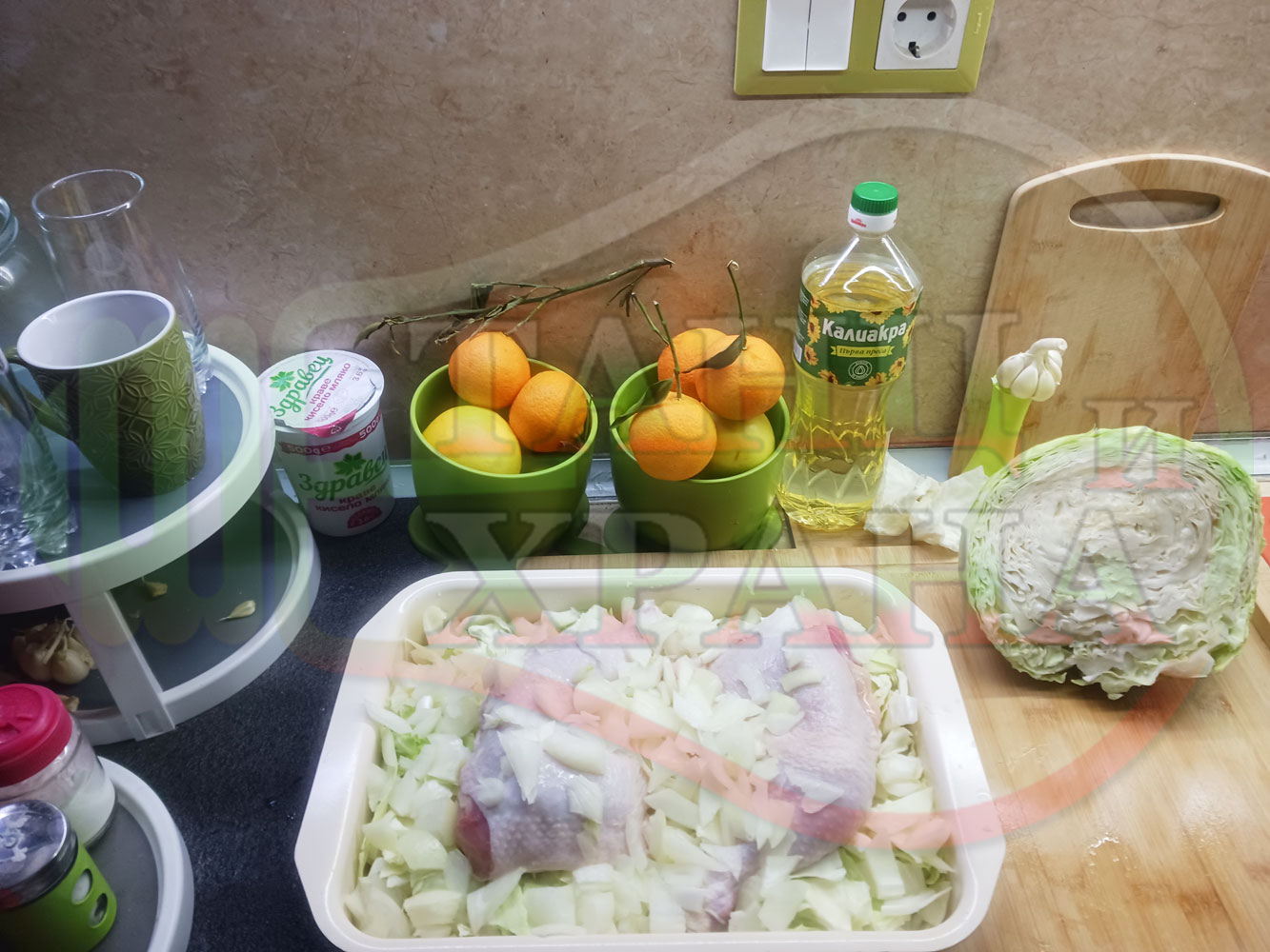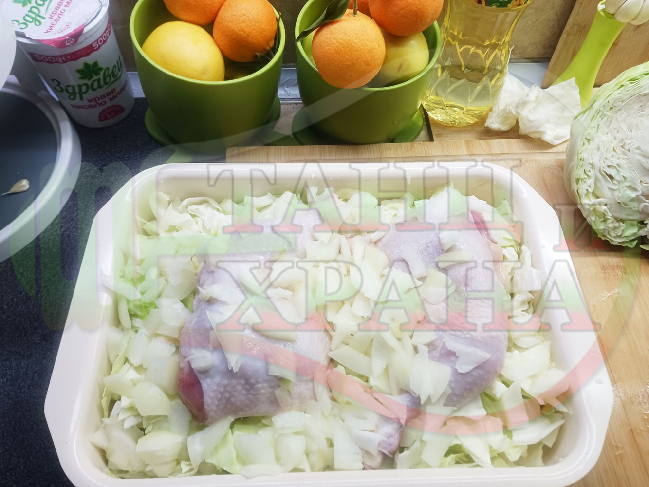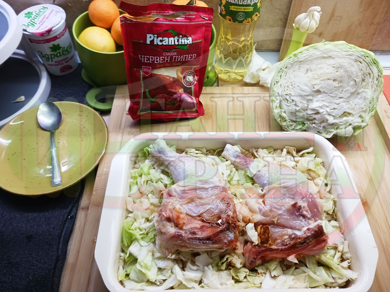 ВНИМАНИЕ: Фурните са различни и съответно времето за сваряване и запичане е ориентировъчно. Наблюдавайте процеса на запичане и при необходимост, покрийте с капак. Разбърквайте и обръщайте често пилешките бутчетата за да се запекат равномерно от всички страни и зелето да се слегне без да се препича.