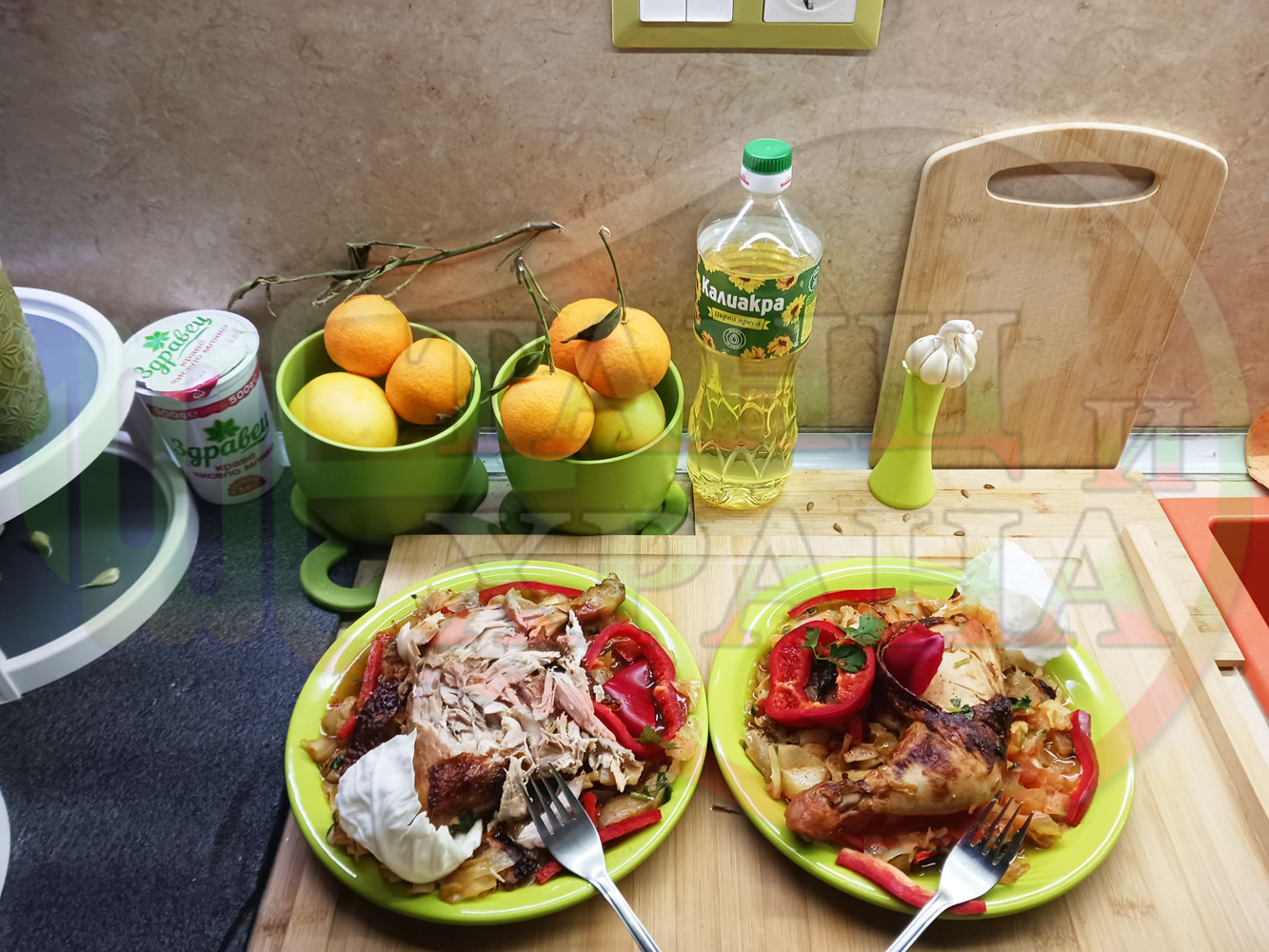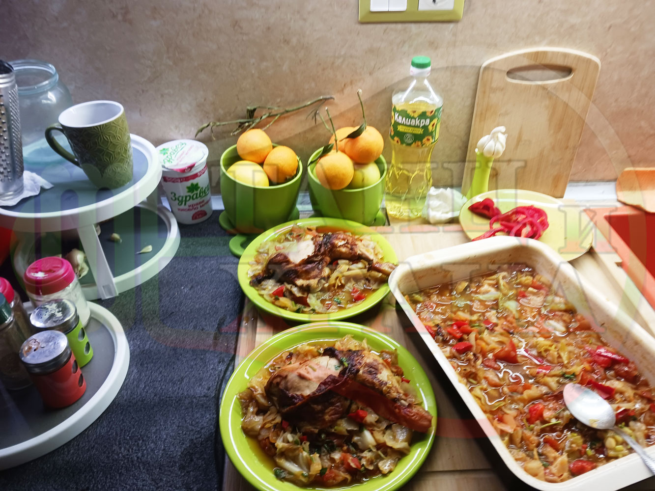 Запекох пилешките бутчета с масло и в кухнята се носи аромат на запечена хрупкава пилешка кожичка, карамелизиран лук и червени пиперки. Спретнах вкусно зеле с маринована херинга от останалото сварено прясно зеле.