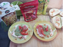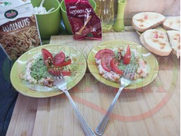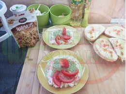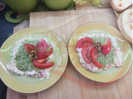 ПРОДУКТИ: Приблизителни количества за българска сурова супа "Краставичнокопърова орехова прясномлечна доматена с БГсирене" приготвена от краставици, прясно мляко, сурови орехи, копър и зелен лук напълнена в кладенчета от сиреново доматен крем с краве бяло сирене и домати - производна