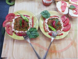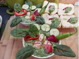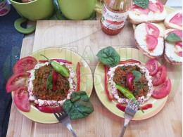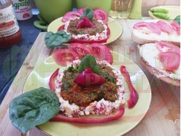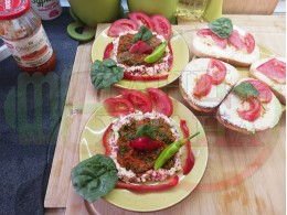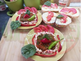 Добавете червен лют и/или сладък пипер при приготвянето на сиреново червеночушковия крем и/или поръсете готовите порции на вкус. Поднесете порциите с препечени на тостер филийки, намазани с краве масло и поръсени с червен сладък пипер и/или шарена сол. Украсете филийките с резенчета от пресния домат и с листенца от спанака (украсете по ваше желание и усмотрение). Измийте домата, нарежете го на резени и подредете еднакъв брой резени около кладенчетата по ваше желание и усмотрение.