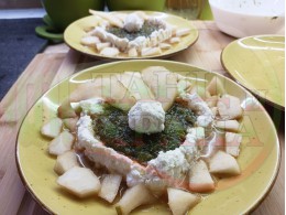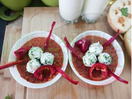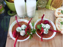Българска сурова супа "Прасковенокрушова червеночушковолютенична с БГсирене" приготвена от червени пресни чушки, праскови, круши и едросмляна лютеница гарнирана с топчета от сиреново магданозен крем с магданоз и краве бяло сирене - двукомпонентна