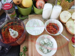 ПРОДУКТИ: Приблизителни количества за българска сурова супа "Прасковенокрушова червеночушковолютенична с БГсирене" приготвена от червени пресни чушки, праскови, круши и едросмляна лютеница гарнирана с топчета от сиреново магданозен крем с магданоз и краве бяло сирене - двукомпонентна