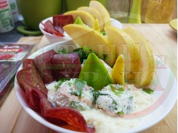 Българската прасковенокрушова сурова, лютенична супа, която сътворих се оказа доста вкусна и се спретва буквално за "нула" време с чопър. Гарнирах супата с топчета от сиреново магданозен чеснов крем приготвени с българско краве бяло саламурено сирене, стар чесън и свеж магданоз и се получи най-вкусната сурова супа, която сме хапвали (поредната най-вкусна сурова супа (всичките сурови супи, които съм приготвяла са вкусни по свой си начин според продуктите, които са включени в тях)). Двукомпонентността на супите (в голямата си част са авторски с иновативен метод на представяне и комбиниране на продуктите (прилагам метода на двукомпонентността в почти всички видове ястия, които приготвям)), позволява да се комбинират различни сурови и/или запечени продукти, с което осъвременявам и обогатявам традиционните български супи, ястия, печива и различни гозби. Сиреновите топчета овкусяват супата с неповторимия вкус, който носят в идеална хармония с плодовата зеленчукова супа и за пореден път се получи голяма вкусно, вкусна, вкусотия (вкуснотия), която е изключително полезна.