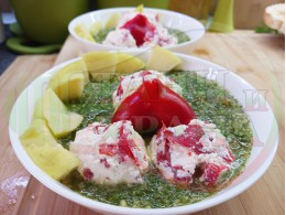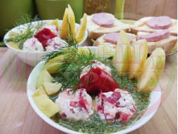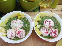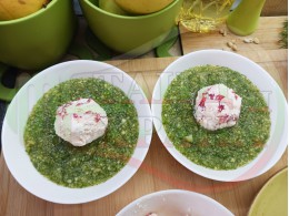 Българска сурова студена супа "Жълтоябълкова копъровозеленочайна с БГсирене" приготвена от пресни ябълки, свеж копър и зелен чай гарнирана с топчета от сиренов крем с червени пресни чушки и краве бяло сирене (българско, саламурено) - двукомпонентна