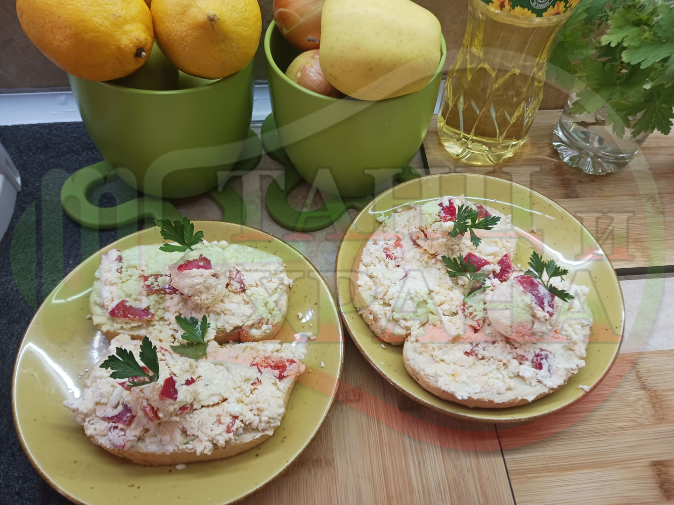 Яйчени орехчета "Сиренови с червени чушки" приготвени от варени яйца с краве бяло сирене и червени пресни чушки