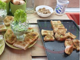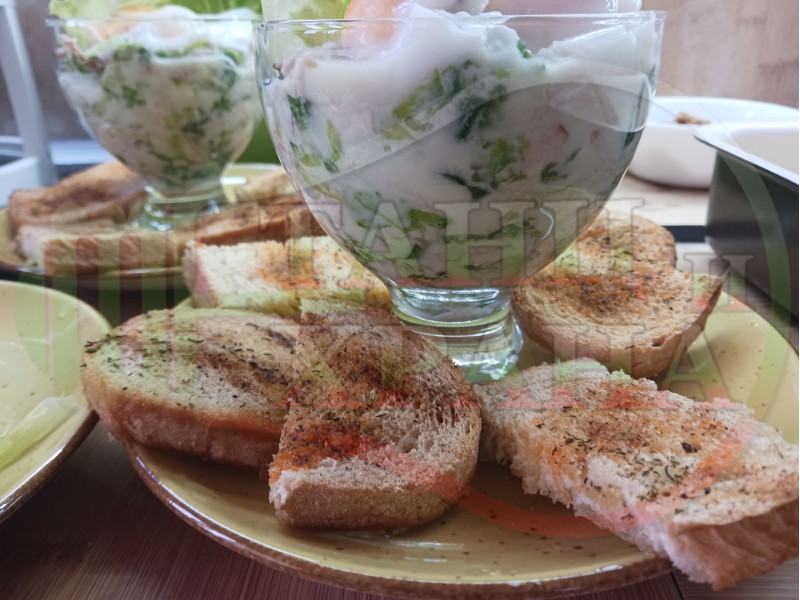Често правя крутони с ронена чубрица и червен сладък пипер. Тези крутони ги направих към млечната салата със забулени яйца и реших да опиша рецептата. Крутоните са с български мерудии, които включвам най-често, когато готвя.