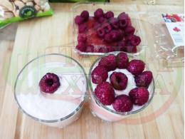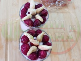 Разпределете сиреновия крем в стъклени чаши и подрете по равен брой измити малини във всяка чаша (или според вместимостта на чашите подредете малините по ваше желание и усмотрение). Поставете по 5 сурови ядки кашу върху малините в произволна форма (броят на ядките и подредбата са по ваше желание и усмотрение).