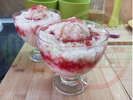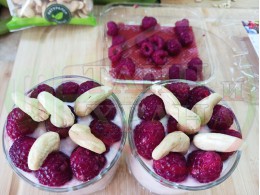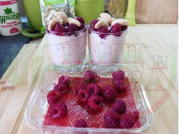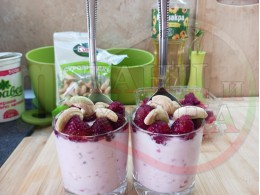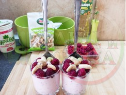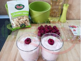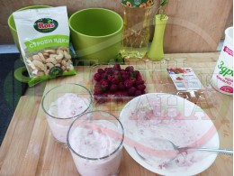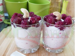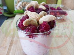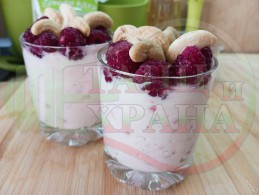 Малинова млечна сладко солена плодова салата "Кашумалинова киселомлечна с БГсирене" приготвен със сиренов малинов млечен крем от пресни малини, краве бяло сирене (българско, саламурено) и кисело мляко от България гарниране със сурово кашу