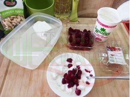 ПРОДУКТИ: Приблизителни количества за малинова млечна сладко солена плодова салата "Кашумалинова киселомлечна с БГсирене" приготвен със сиренов малинов млечен крем от пресни малини, краве бяло сирене (българско, саламурено) и кисело мляко от България гарниране със сурово кашу