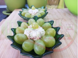 Сипете от готовия сиренов крем в средно големи купи, стъклени чаши или каквито съдове имате и го загладете. Измийте гроздето, изберете по-хубави и здрави зърна и ги подредете върху сиреновия крем в произволна форма или по диаметъра на купите (подредете гроздето по ваше желание и усмотрение). Сипете по 1 супена лъжица кисело мляко в "центъра" на купите върху сиреновия крем и поставете по една напълнена половина от кайсията (напълнете 2-те половини на кайсията със сиреновите топчета). Украсете порциите с нарязаните ивички от кайсиите (украсете по ваше желание и усмотрение).