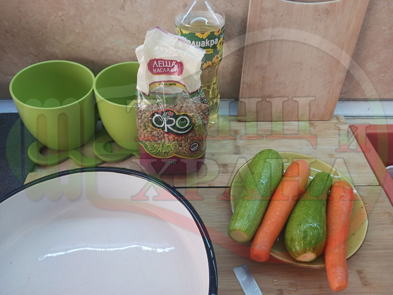 ПРОДУКТИ: Приблизителни количества за тръляна леща "Лещеноморковена с тиквички" сварена на фурна с кромид лук, моркови, тиквички, червен сладък пипер и ронена чубрица претръляна с краве масло
