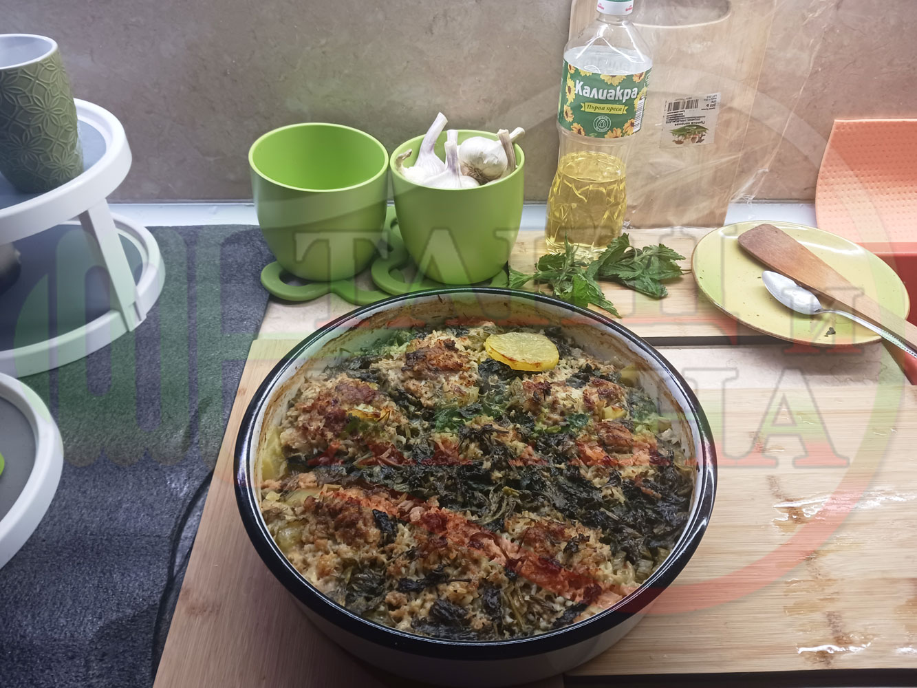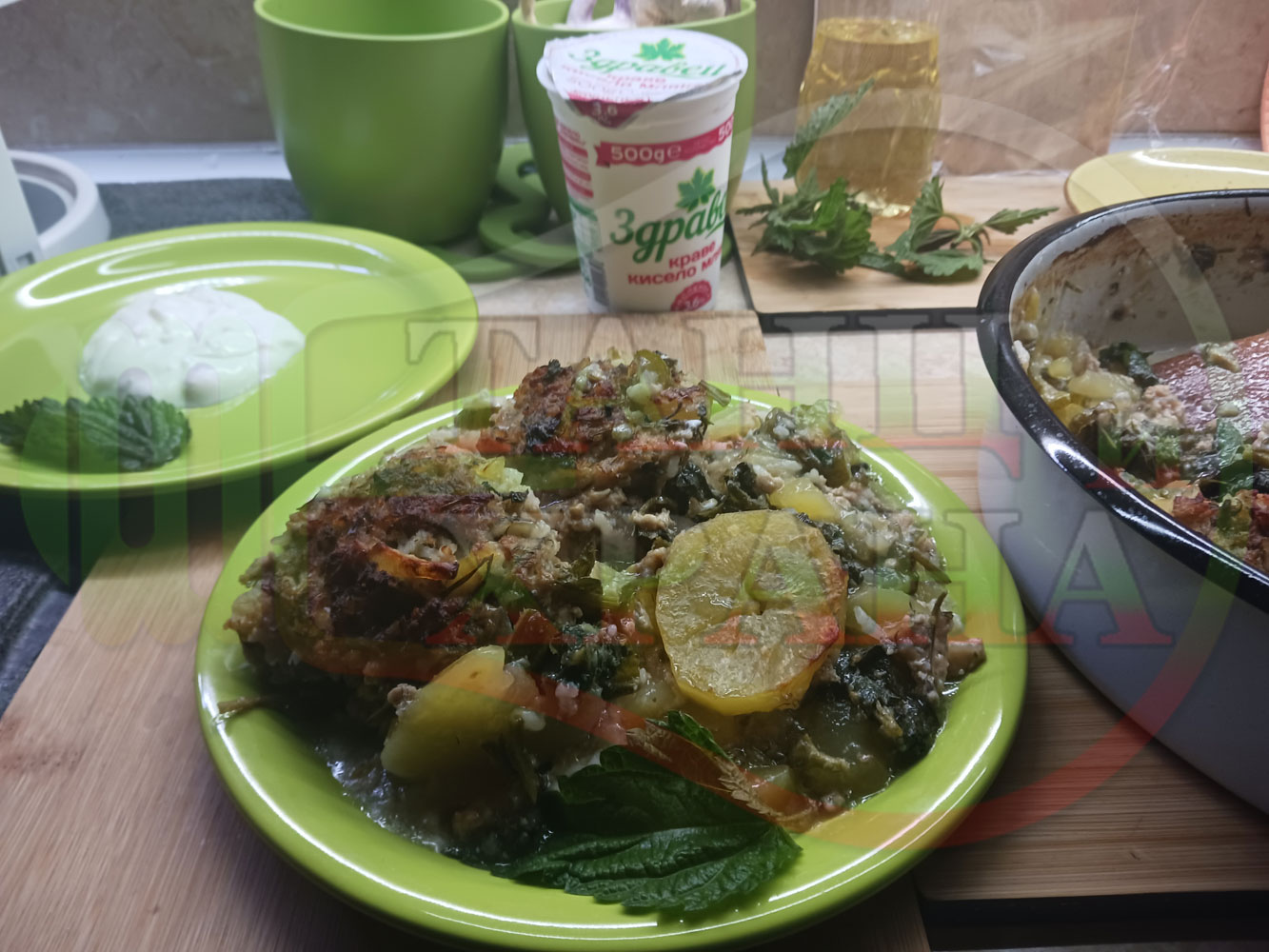 Копривна яхния с кюфтета от кайма и ориз "Краставична с големи кюфтета и коприва" приготвена на фурна с краставици, пресен лук, картофи и свежа коприва гарнирана с кисело мляко от България