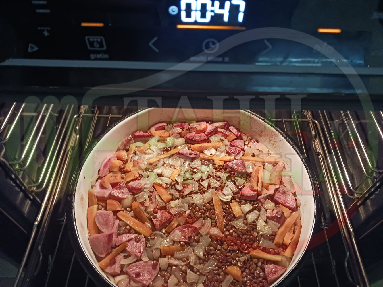 Обелете салама, нарежете го на едро и го сипете в тава за печене заедно с обеления, измит и нарязан на едро кромид лук. Измийте морковите, нарежете ги на различни по големина и форма парченца и ги сипете в тавата заедно с измитата леща. Сипете солта и слънчогледовото олио и налейте топла към гореща вода от чешмата. Разбъркайте и поставете тавата в предварително загрятата фурна (загрейте я за поне 5 минути). Сварете и леко запечете на фурна без вентилатор на 180 градуса за около 90 минути.