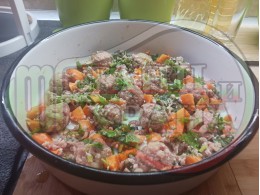 Супа топчета "Топчеста с моркови" приготвена на фурна с картофи, ориз, кромид лук и моркови с топчета от овкусена кайма (свинско и телешко) с яйца, мерудии и свеж магданоз