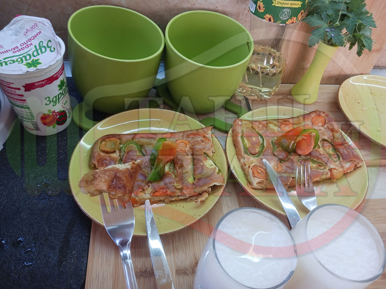 Бухтена пита "Морковена зеленочушкова" изпечена на фурна със зелени пресни чушки и моркови и стар чесън омесена с яйца, сода за хляб и кисело мляко от България
