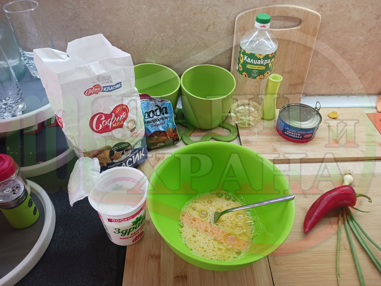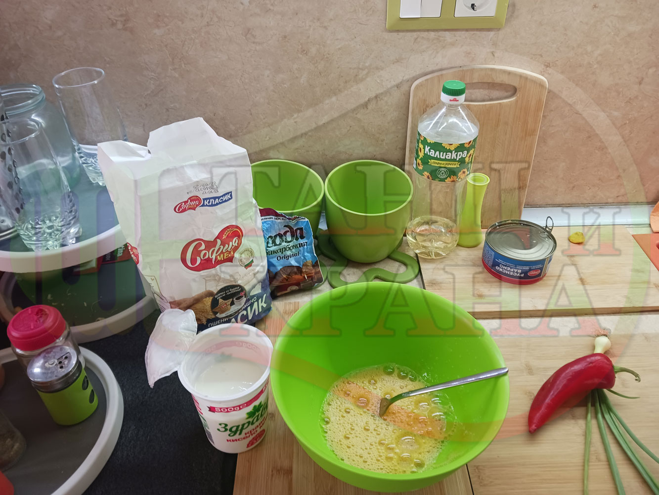 ПРОДУКТИ: Приблизителни количества за бухтена пита "Русенсковарена червеночушкова" изпечена на фурна с топчета от русенско варено, червени пресни чушки и зелен пресен лук омесена с яйца, сода за хляб и кисело мляко от България