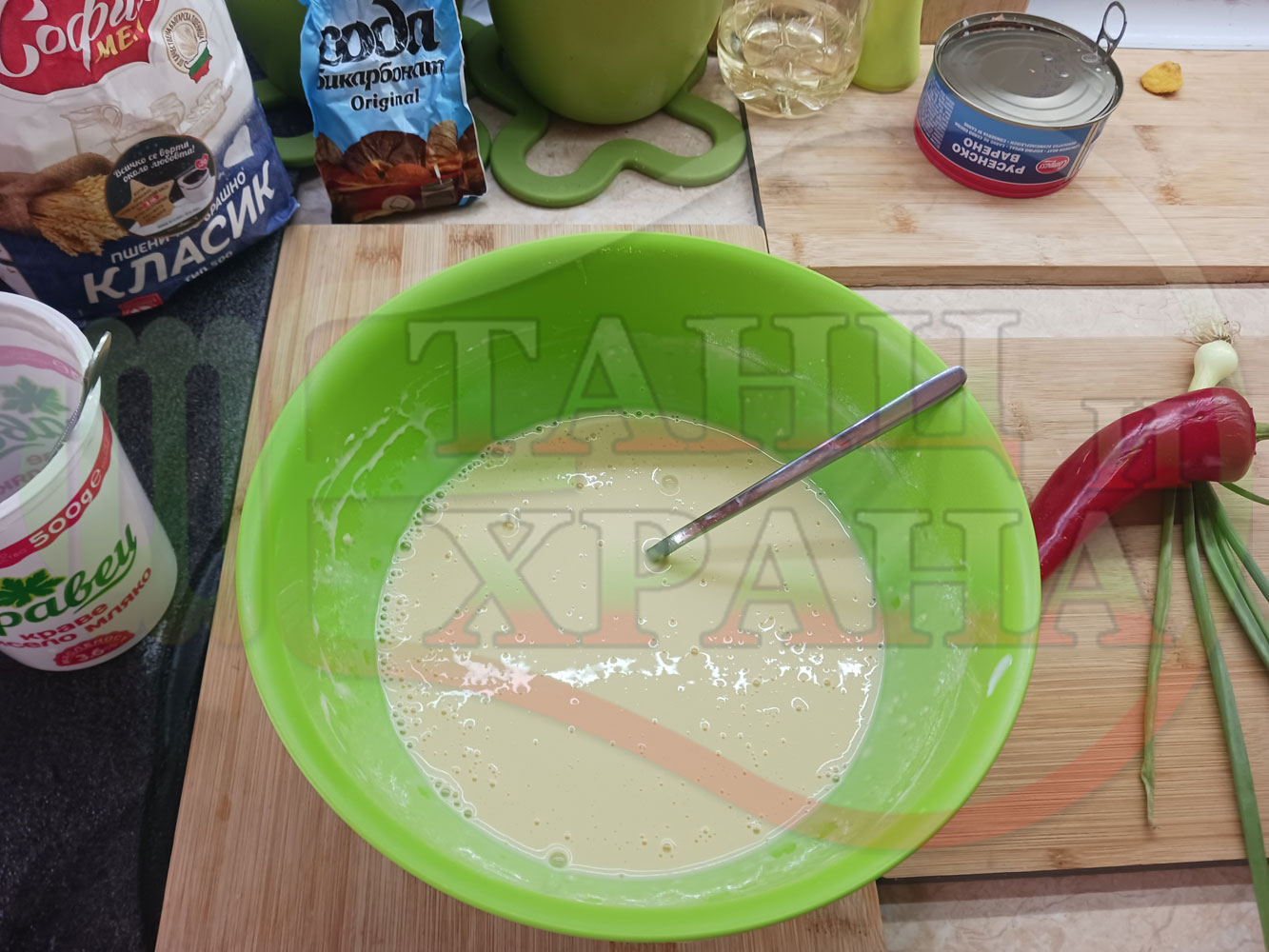 Разбийте яйцата в купа заедно със захарта и солта. Добавете брашното и разбъркайте (на този етап сместта е доста гъста). Сипете содата за хляб в киселото мляко и разбъркайте до пълното и разтваряне и "шупване" на млякото (прегасяване на содата). Изсипете киселото мляко с разтворената в него сода в купата и разбъркайте. Налейте хладка към топла вода от чешмата в кофичката от млякото или купата, в която сте прегасили содата и оберете от стените на кофичката млякото, така че да "овкусите" водата. Изсипете овкусената вода и отново разбъркайте до образуване на сравнително рядка бухтена смес (подобна на палачинковата).