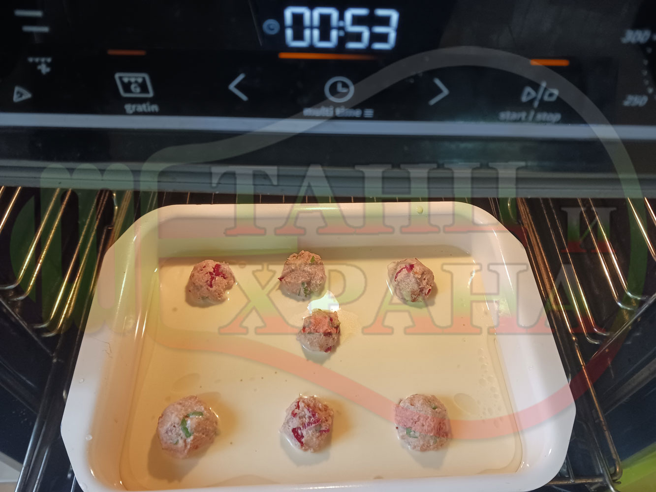 ВНИМАНИЕ: Фурните са различни и съответно времето за запичане е ориентировъчно. Наблюдавайте процеса на запичане и при необходимост, покрийте с хартия или фолио за печене. За по-равномерно изпичане е желателно да покриете тавата веднага след поставянето и във фурната (имайте предвид, че топчетата се разтичат при запичане).
