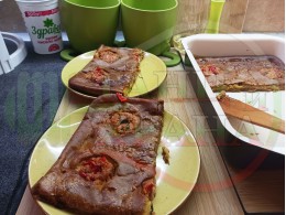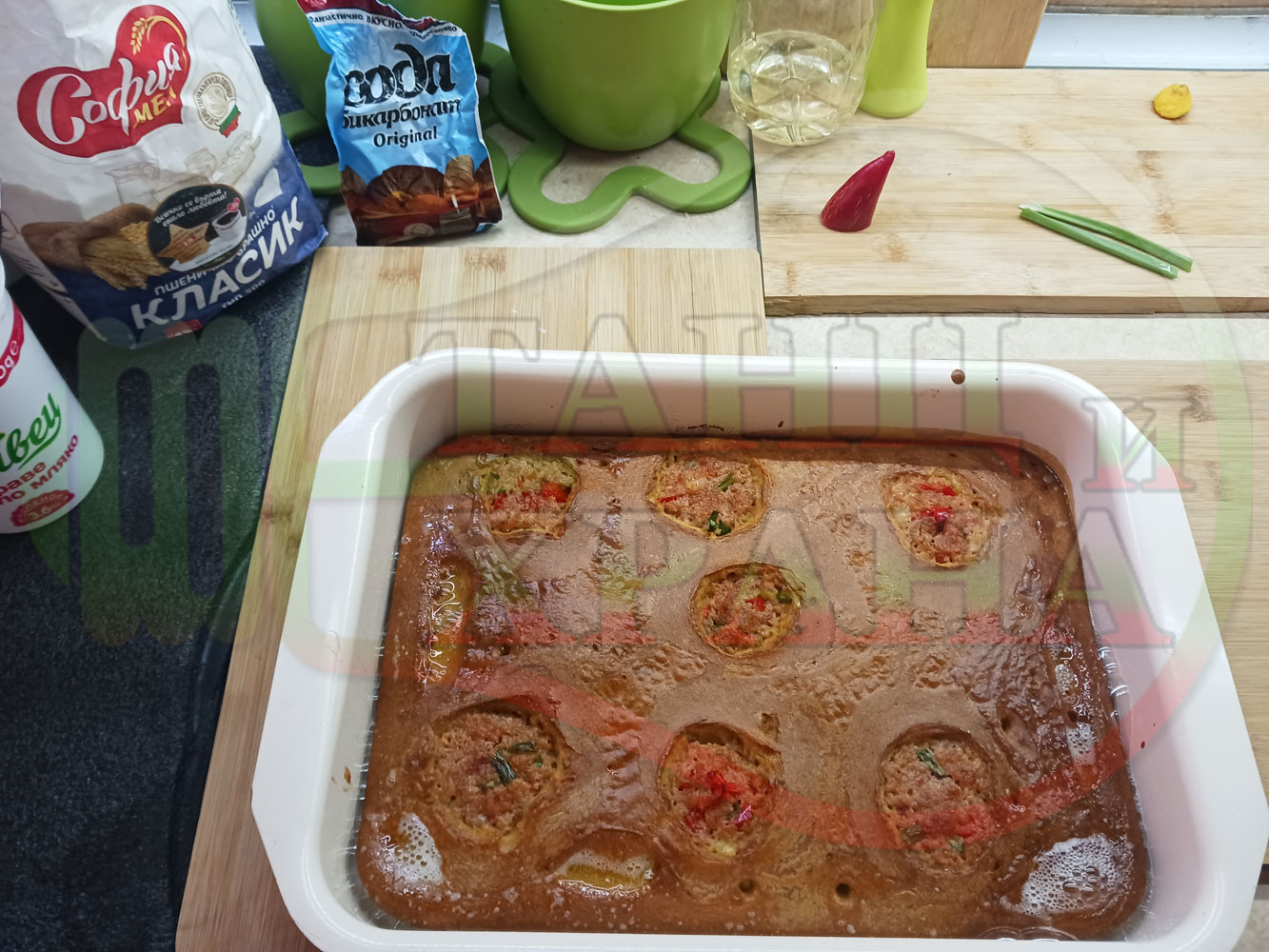 Бухтена пита "Русенсковарена червеночушкова" изпечена на фурна с топчета от русенско варено, червени пресни чушки и зелен пресен лук омесена с яйца, сода за хляб и кисело мляко от България
