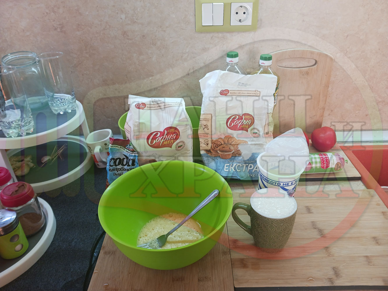 Разбийте яйцата в купа. Сипете киселото мляко в чаша или друг подходящ съд. Добавете содата за хляб и разбъркайте до "шупване". Сипете млякото със содата в купата и разбъркайте. Добавете брашното, захарта и солта и отново разбъркайте. Сипете хладка вода от чешмата в чашата или малката купа, в която сте разтворили содата. Разбъркайте за да се "овкуси" водата. Сипете водата в купата и разбъркайте до образуване на средно гъста хомогенна смес - бухтено тесто.