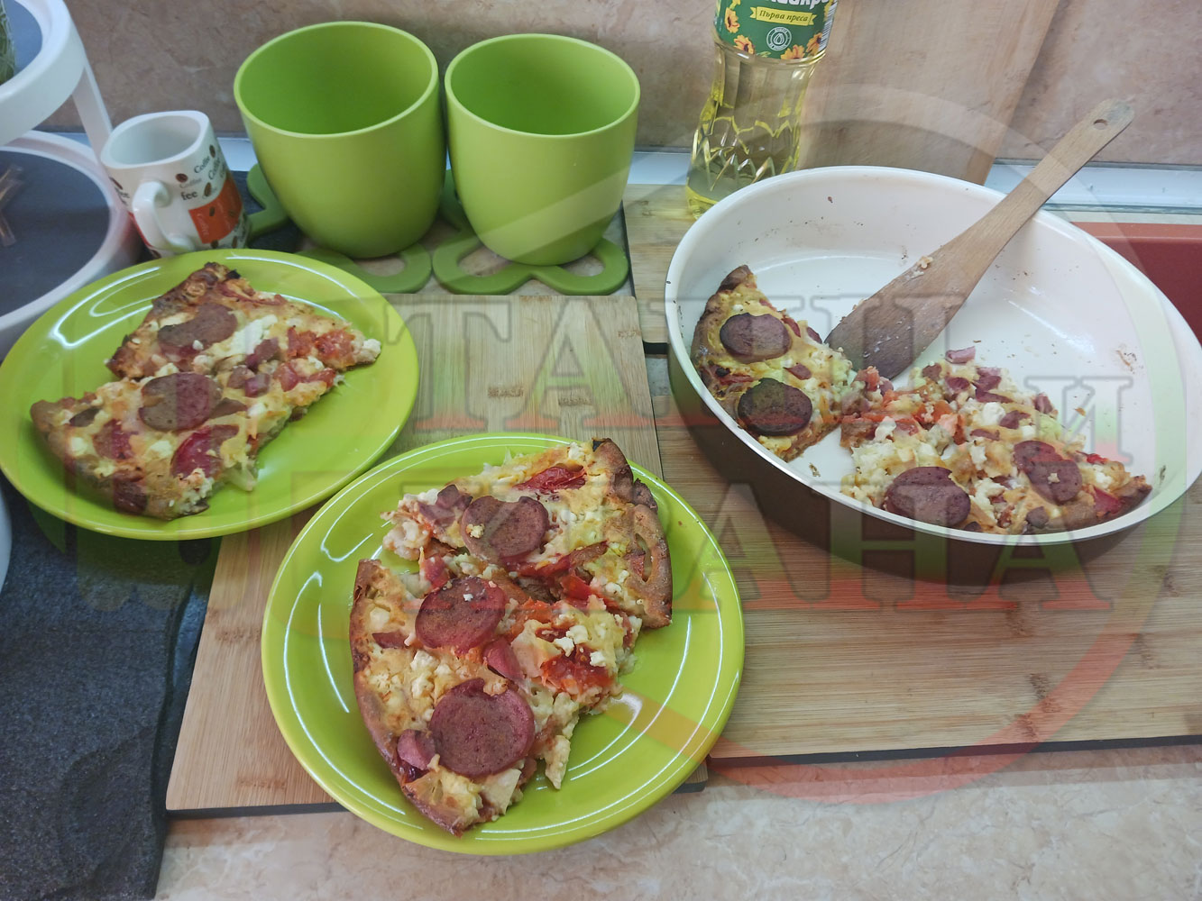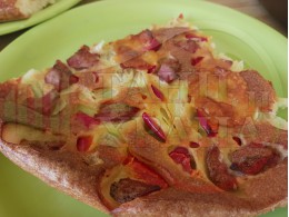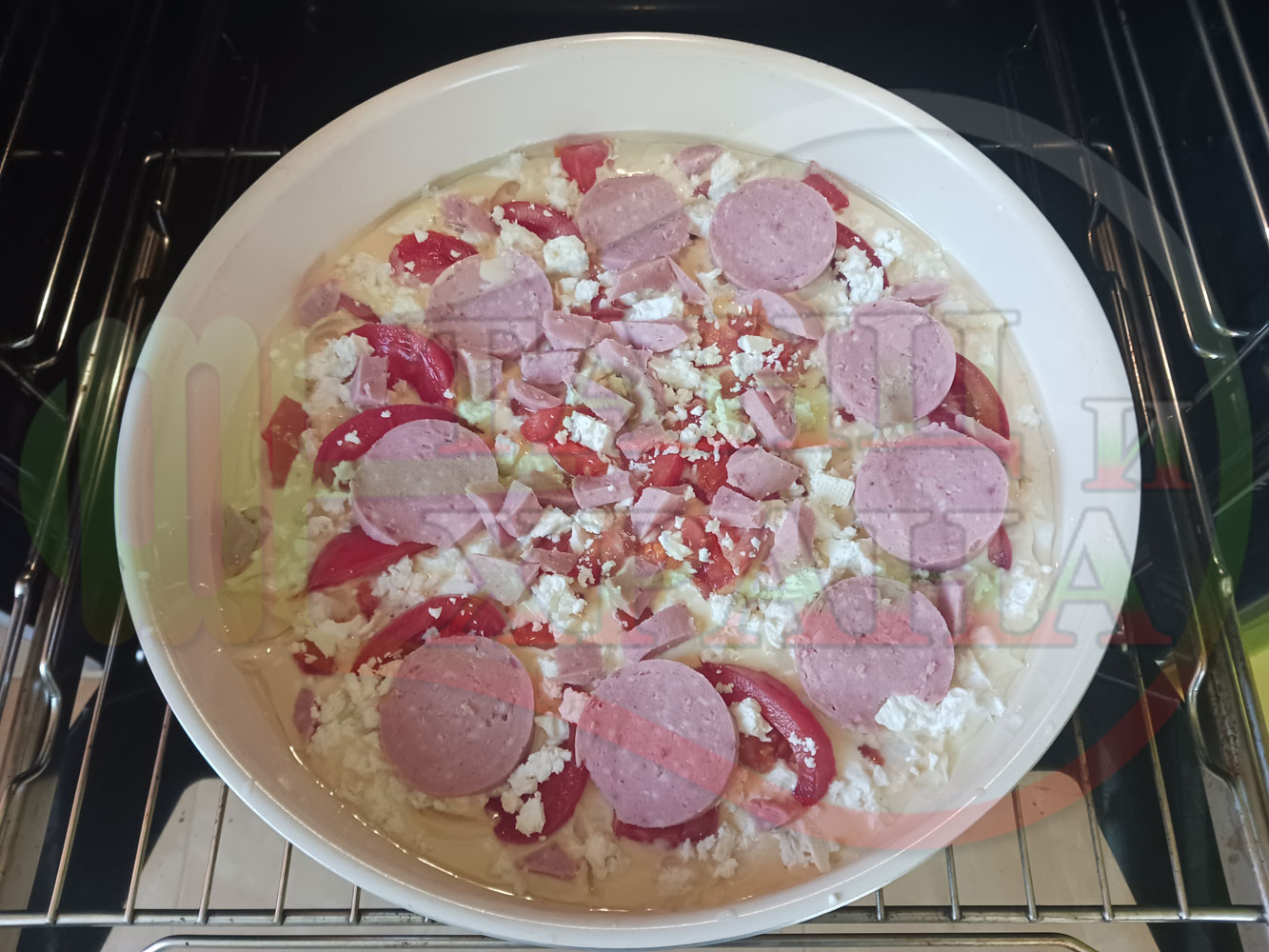 Бухтена плоска солена торта "Саламова с домати и сирене" със салам, домати, краве бяло сирене и кромид лук омесена с кисело мляко от България