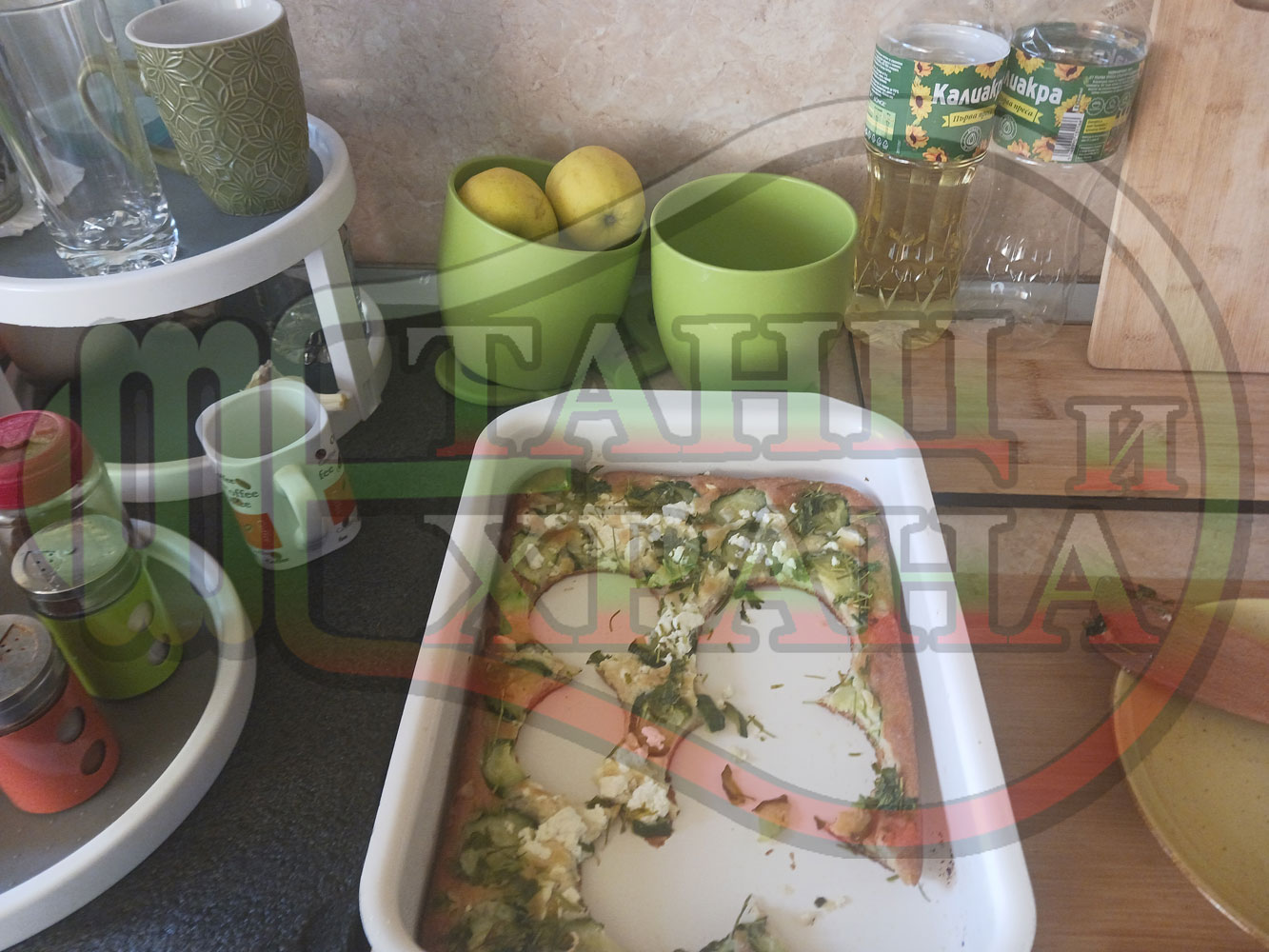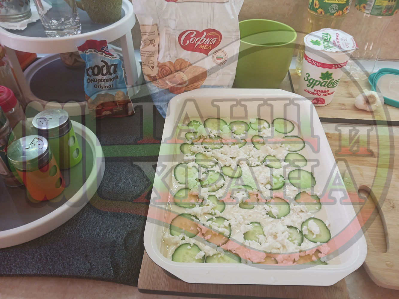 Изсипете сместта в намазана с олио тава за печене. Измийте краставицата и я нарежете на кръгчета без да я белите. Подредете кръгчетата върху бухтената смес. Нарежете чесъна на едро. Добавете го на произволни места. Измийте и нарежете магданоза на едро. Добавете го без да разбърквате.