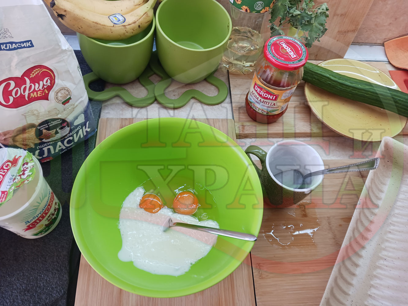 Разбийте яйцата със солта и захарта в купа заедно с киселото мляко и разтворената в него сода за хляб ("прегасете" содата в млякото преди да я изсипете). Добавете брашното, разбъркайте до гъста смес и изсипете "овкусената" млечна вода ( "овкусете" водата с разтваряне на останалото кисело мляко в купата или кофичката, в която сте прегасявали содата ). Отново разбъркайте до получаване на сравнително рядко, хомогенно бухтено тесто.