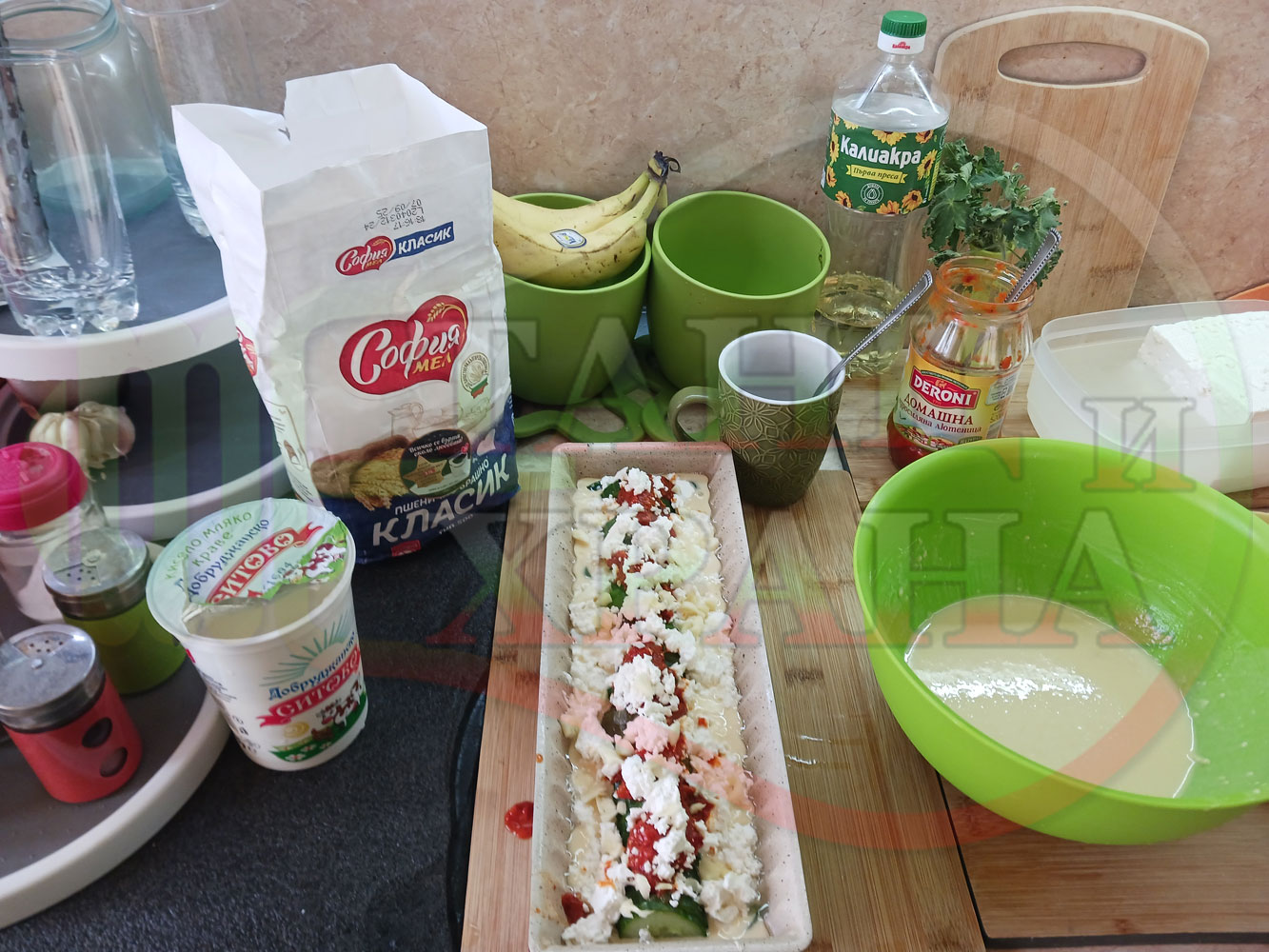 ПРОДУКТИ: Приблизителни количества за солено бухтено руло "Краставичнолютенично с БГсирене" запечено на фурна с плънка от пресни краставици, лютеница и краве бяло сирене (българско, саламурено) омесено със сода за хляб и кисело мляко от България