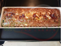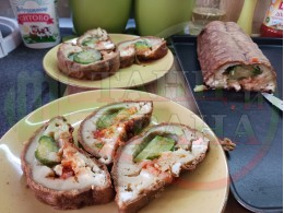 Бухтено руло "Краставичнолютенично с БГсирене" запечено на фурна с плънка от пресни краставици, лютеница и краве бяло сирене (българско, саламурено) омесено със сода за хляб и кисело мляко от България