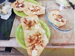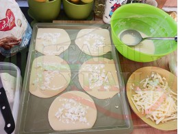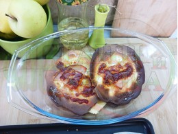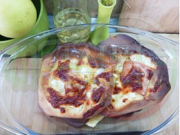 Двузапечени палачинки "Пуешкокашкавалени прясномлечни с БГсирене" запечени на фурна с краве бяло сирене (българско, саламурено), млечен кашкавал, червен сладък пипер и пуешко жарено филе намазани с краве масло омесени с яйца и прясно мляко